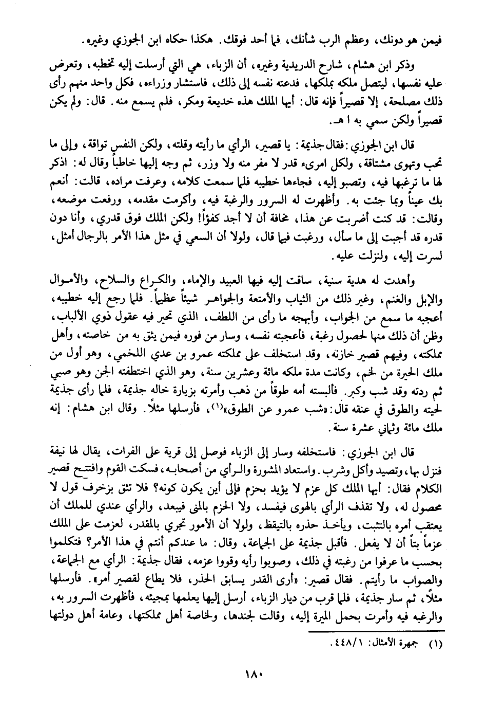وأهدت له هدية سنية، ساقت إليه فيها العبيد والإماء، والكراع والسلاح، والأموال والإبل والغنم، وغير ذلك من الثياب والأمتعة والجواهر شيئا عظيما. فلما رجع إليه خطيبه، أعجبه ما سمع من الجواب، وأبهجه ما رأى من اللطف، الذي تحير فيه عقول ذوي الألباب، وظن أن ذلك منها لحصول رغبة، فأعجبته نفسه، وسار من فوره فيمن يثق به من خاصته، وأهل مملكته، وفيهم قصير خازنه، وقد استخلف على مملكته عمرو بن عدي اللخمي، وهو أول من ملك الحيرة من لخم، وكانت مدة ملكه مائة وعشرين سنة، وهو الذي اختطفته الجن وهو صبي ثم ردته وقد شب وكبر. فألبسته أمه طوقا من ذهب وأمرته بزيارة خاله جذيمة، فلما رأى جذيمة لحيته والطوق في عنقه قال: «شب عمرو عن الطوق» «1» ، فأرسلها مثلا. وقال ابن هشام: إنه ملك مائة وثماني عشرة سنة.