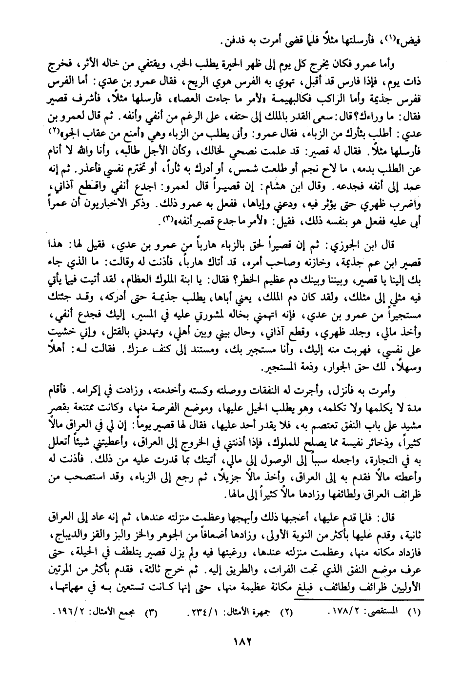 وأما عمرو فكان يخرج كل يوم إلى ظهر الحيرة يطلب الخبر، ويقتفي من خاله الأثر، فخرج ذات يوم، فإذا فارس قد أقبل، تهوي به الفرس هوي الريح، فقال عمرو بن عدي: أما الفرس ففرس جذيمة وأما الراكب فكالبهيمة «لأمر ما جاءت العصا» ، فأرسلها مثلا، فأشرف قصير فقال: ما وراءك؟ قال: سعى القدر بالملك إلى حتفه، على الرغم من أنفي وأنفه. ثم قال لعمرو بن عدي: أطلب بثأرك من الزباء، فقال عمرو: وأنى يطلب من الزباء وهي «أمنع من عقاب الجو» «2» فأرسلها مثلا. فقال له قصير: قد علمت نصحي لخالك، وكأن الأجل طالبه، وأنا والله لا أنام عن الطلب بدمه، ما لاح نجم أو طلعت شمس، أو أدرك به ثأرا، أو تخترم نفسي فأعذر. ثم إنه عمد إلى أنفه فجدعه. وقال ابن هشام: إن قصيرا قال لعمرو: اجدع أنفي واقطع آذاني، واضرب ظهري حتى يؤثر فيه، ودعني وإياها، ففعل به عمرو ذلك. وذكر الاخباريون أن عمرا أبى عليه ففعل هو بنفسه ذلك، فقيل: «لأمر ما جدع قصير أنفه» «3» .
