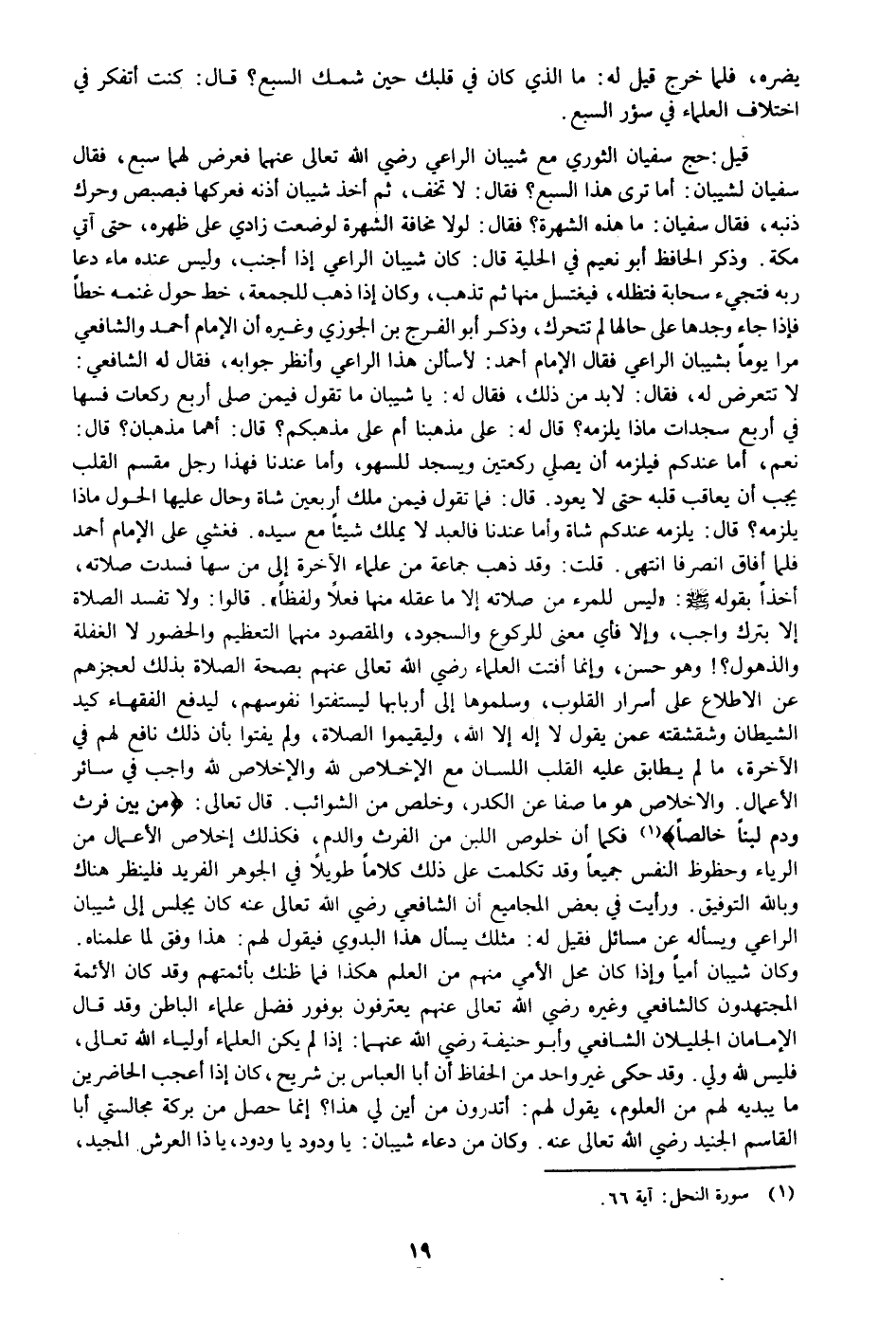 «1» فكما أن خلوص اللبن من الفرث والدم، فكذلك إخلاص الأعمال من الرياء وحظوظ النفس جميعا وقد تكلمت على ذلك كلاما طويلا في الجوهر الفريد فلينظر هناك وبالله التوفيق. ورأيت في بعض المجاميع أن الشافعي رضي الله تعالى عنه كان يجلس إلى شيبان الراعي ويسأله عن مسائل فقيل له: مثلك يسأل هذا البدوي فيقول لهم: هذا وفق لما علمناه.