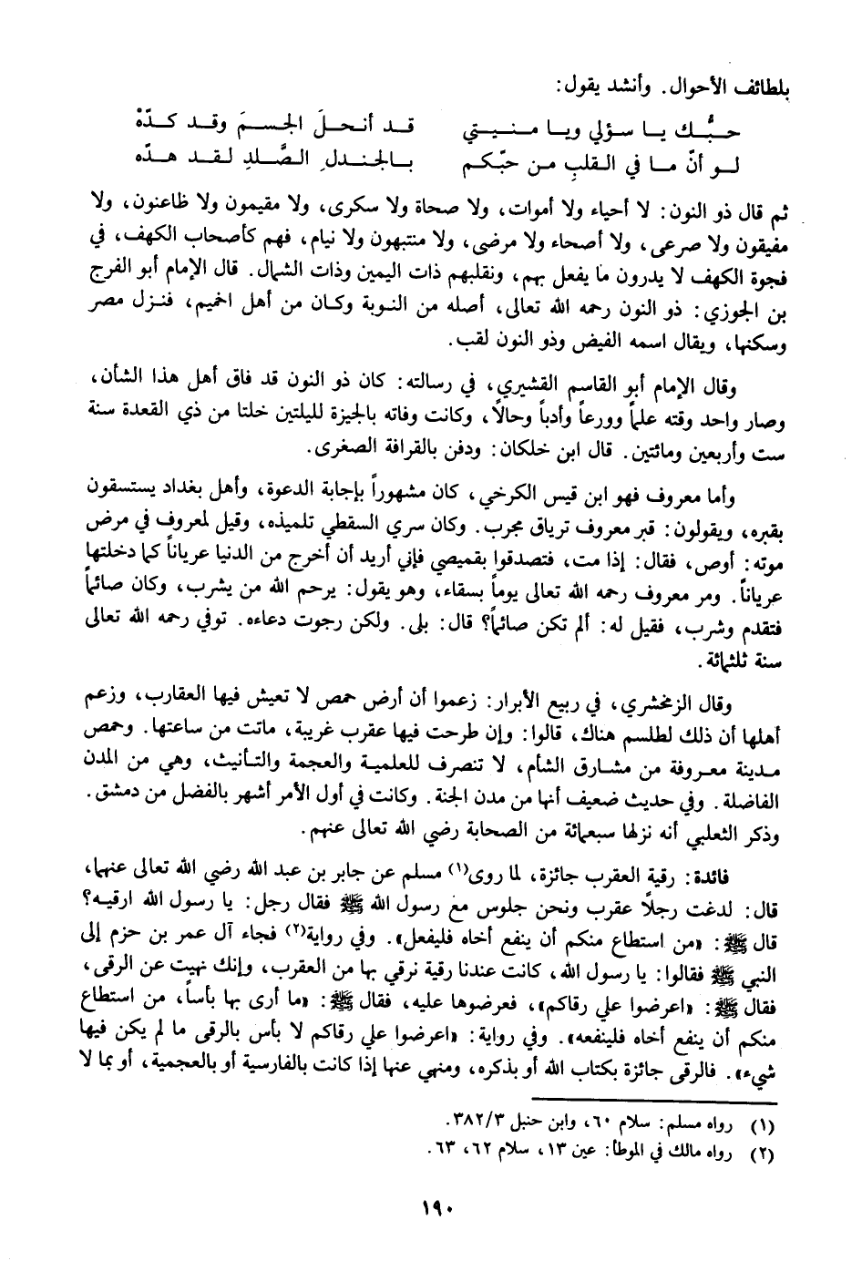 ثم قال ذو النون: لا أحياء ولا أموات، ولا صحاة ولا سكرى، ولا مقيمون ولا ظاعنون، ولا مفيقون ولا صرعى، ولا أصحاء ولا مرضى، ولا منتبهون ولا نيام، فهم كأصحاب الكهف، في فجوة الكهف لا يدرون ما يفعل بهم، ونقلبهم ذات اليمين وذات الشمال. قال الإمام أبو الفرج بن الجوزي: ذو النون رحمه الله تعالى، أصله من النوبة وكان من أهل اخميم، فنزل مصر وسكنها، ويقال اسمه الفيض وذو النون لقب.