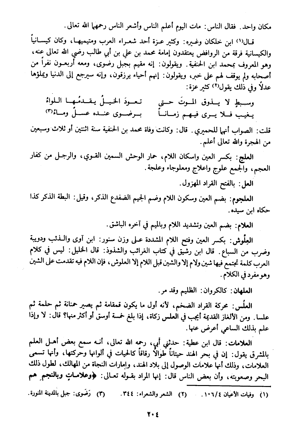 قلت: الصواب أنهما للحميري. قال: وكانت وفاة محمد بن الحنفية سنة اثنتين أو ثلاث وسبعين من الهجرة والله تعالى أعلم.