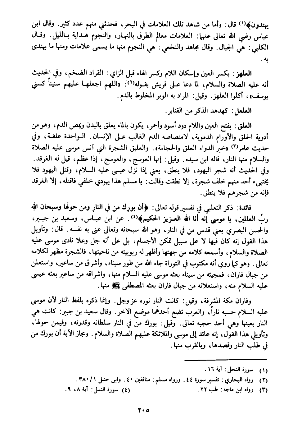 «1» قال: وأما من شاهد تلك العلامات في البحر، فحدثني منهم عدد كثير. وقال ابن عباس رضي الله تعالى عنهما: العلامات معالم الطرق بالنهار، والنجوم هداية بالليل. وقال الكلبي: هي الجبال. وقال مجاهد والنخعي: هي النجوم منها ما يسمى علامات ومنها ما يهتدى به.