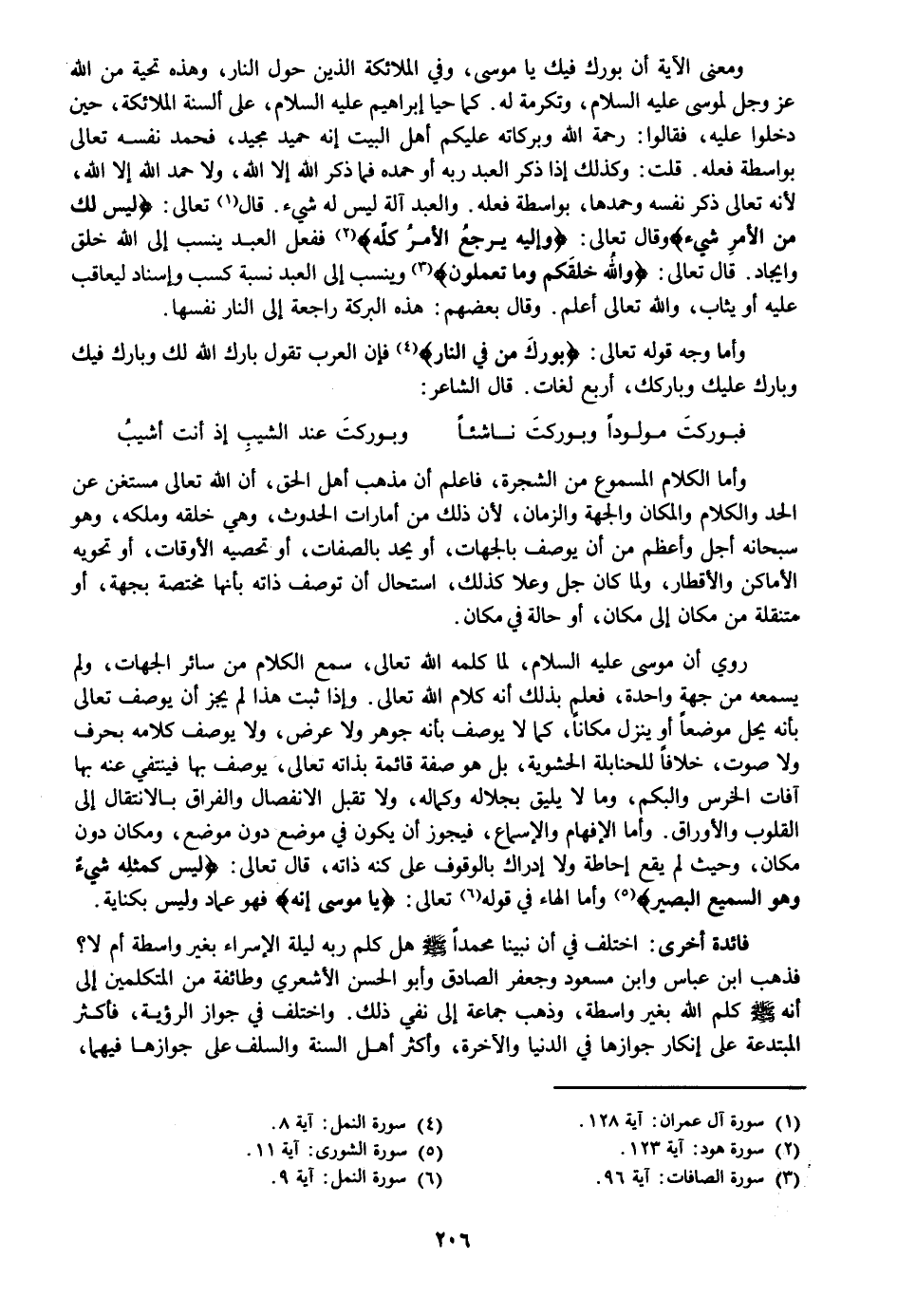 وأما الكلام المسموع من الشجرة، فاعلم أن مذهب أهل الحق، أن الله تعالى مستغن عن الحد والكلام والمكان والجهة والزمان، لأن ذلك من أمارات الحدوث، وهي خلقه وملكه، وهو سبحانه أجل وأعظم من أن يوصف بالجهات، أو يحد بالصفات، أو تحصيه الأوقات، أو تحويه الأماكن والأقطار، ولما كان جل وعلا كذلك، استحال أن توصف ذاته بأنها مختصة بجهة، أو متنقلة من مكان إلى مكان، أو حالة في مكان.