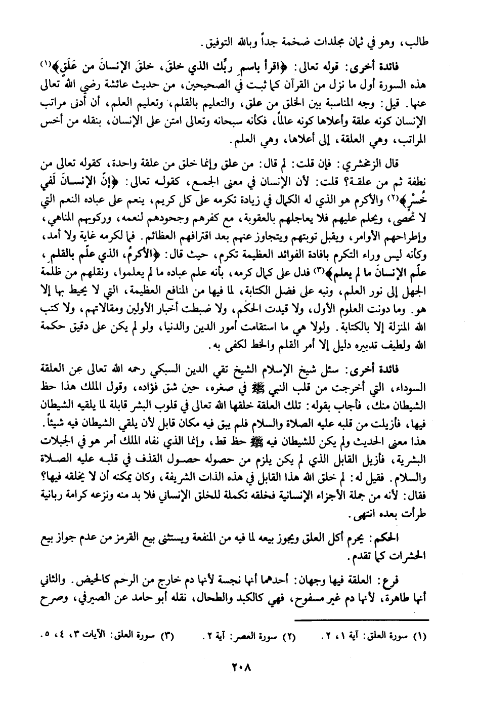 «1» هذه السورة أول ما نزل من القرآن كما ثبت في الصحيحين، من حديث عائشة رضي الله تعالى عنها. قيل: وجه المناسبة بين الخلق من علق، والتعليم بالقلم، وتعليم العلم، أن أدنى مراتب الإنسان كونه علقة وأعلاها كونه عالما، فكأنه سبحانه وتعالى امتن على الإنسان، بنقله من أخس المراتب، وهي العلقة، إلى أعلاها، وهي العلم.