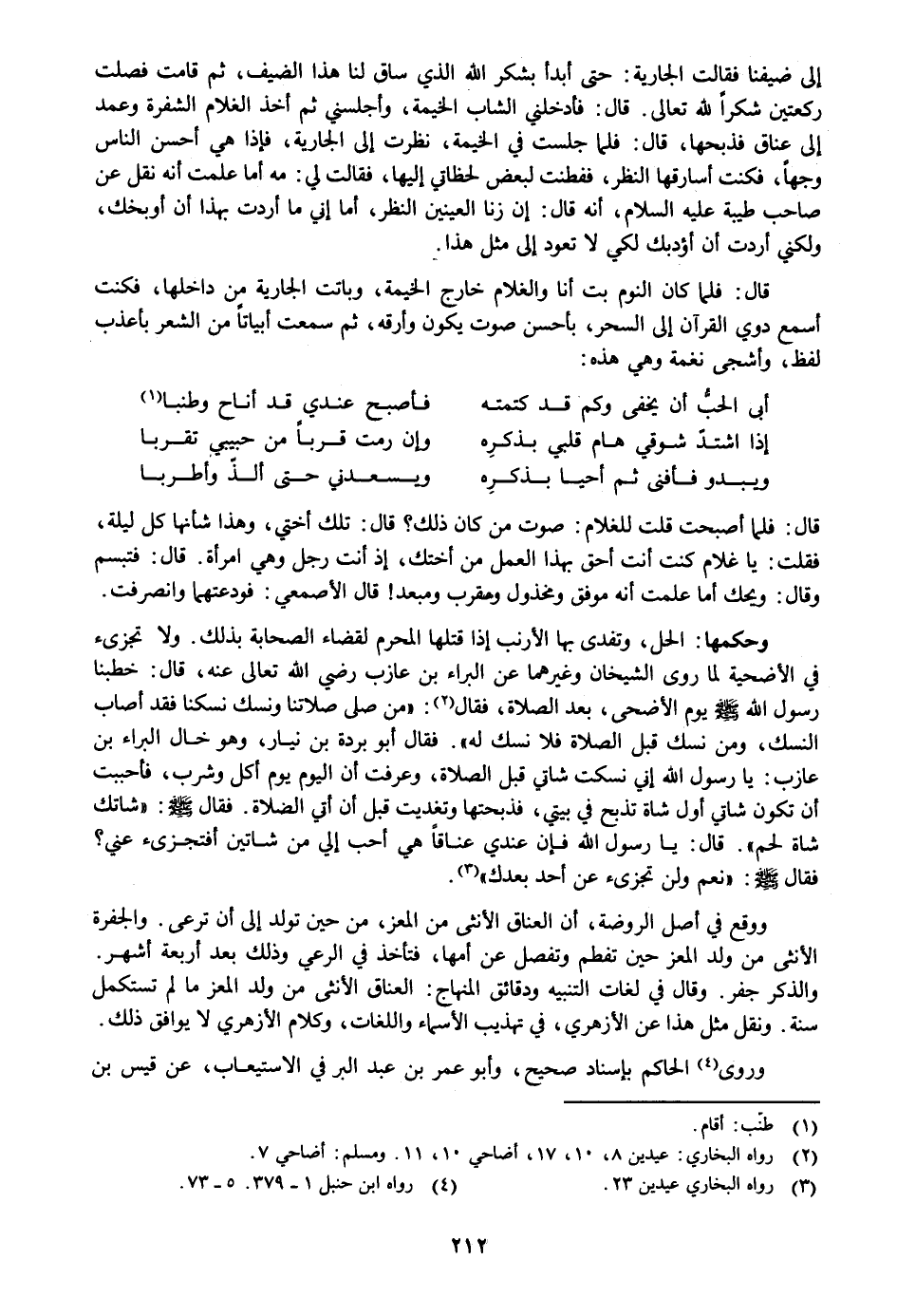 إلى ضيفنا فقالت الجارية: حتى أبدأ بشكر الله الذي ساق لنا هذا الضيف، ثم قامت فصلت ركعتين شكرا لله تعالى. قال: فأدخلني الشاب الخيمة، وأجلسني ثم أخذ الغلام الشفرة وعمد إلى عناق فذبحها، قال: فلما جلست في الخيمة، نظرت إلى الجارية، فإذا هي أحسن الناس وجها، فكنت أسارقها النظر، ففطنت لبعض لحظاتي إليها، فقالت لي: مه أما علمت أنه نقل عن صاحب طيبة عليه السلام، أنه قال: إن زنا العينين النظر، أما إني ما أردت بهذا أن أوبخك، ولكني أردت أن أؤدبك لكي لا تعود إلى مثل هذا.
