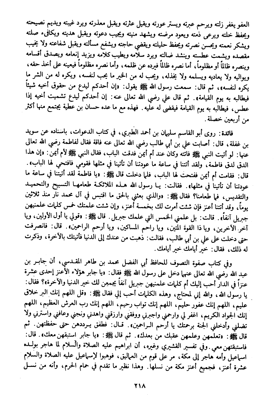 وفي كتاب صفوة التصوف للحافظ أبي الفضل محمد بن طاهر المقدسي، أن جابر بن عبد الله رضي الله تعالى عنهما دخل على رسول الله صلى الله عليه وسلم فقال: «يا جابر هؤلاء الأعنز إحدى عشرة عنزا في الدار أحب إليك أم كلمات علمنيهن جبريل آنفا يجمعن لك خير الدنيا والآخرة» ؟ فقال: