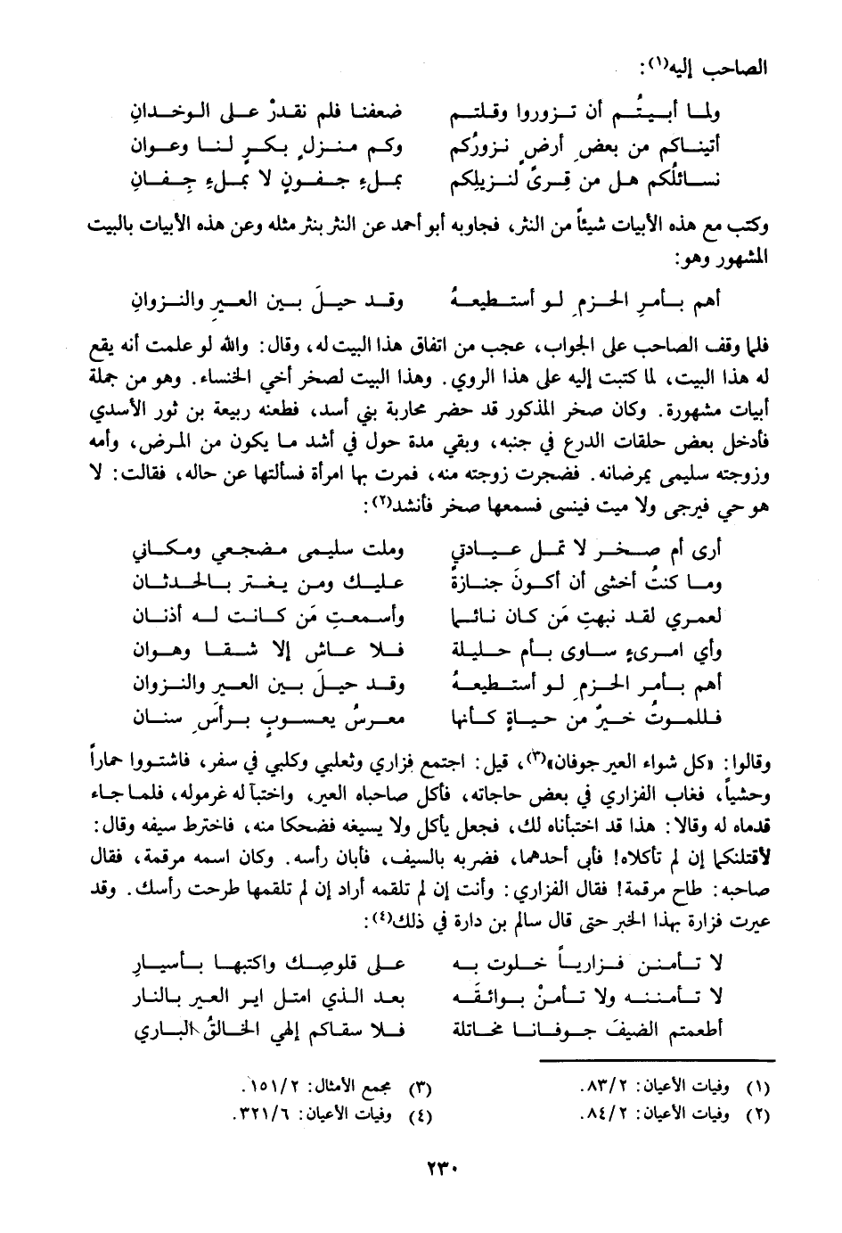 فلما وقف الصاحب على الجواب، عجب من اتفاق هذا البيت له، وقال: والله لو علمت أنه يقع له هذا البيت، لما كتبت إليه على هذا الروي. وهذا البيت لصخر أخي الخنساء. وهو من جملة أبيات مشهورة. وكان صخر المذكور قد حضر محاربة بني أسد، فطعنه ربيعة بن ثور الأسدي فأدخل بعض حلقات الدرع في جنبه، وبقي مدة حول في أشد ما يكون من المرض، وأمه وزوجته سليمى يمرضانه. فضجرت زوجته منه، فمرت بها امرأة فسألتها عن حاله، فقالت: لا هو حي فيرجى ولا ميت فينسى فسمعها صخر فأنشد «2» :