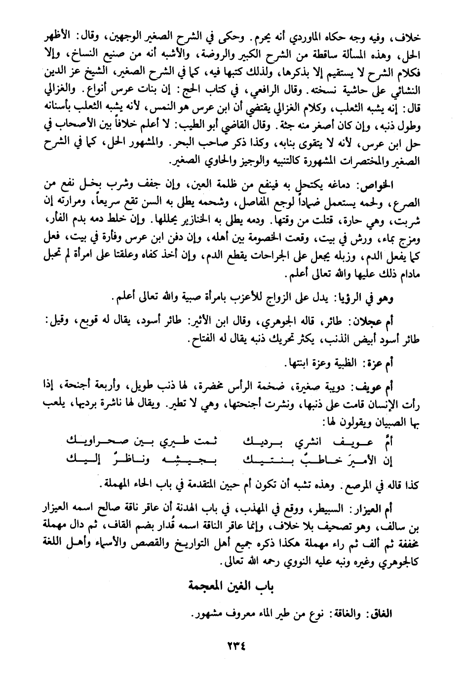 خلاف، وفيه وجه حكاه الماوردي أنه يحرم. وحكى في الشرح الصغير الوجهين، وقال: الأظهر الحل، وهذه المسألة ساقطة من الشرح الكبير والروضة، والأشبه أنه من صنيع النساخ، وإلا فكلام الشرح لا يستقيم إلا بذكرها، ولذلك كتبها فيه، كما في الشرح الصغير، الشيخ عز الدين النشائي على حاشية نسخته. وقال الرافعي، في كتاب الحج: إن بنات عرس أنواع. والغزالي قال: إنه يشبه الثعلب، وكلام الغزالي يقتضي أن ابن عرس هو النمس، لأنه يشبه الثعلب بأسنانه وطول ذنبه، وإن كان أصغر منه جثة. وقال القاضي أبو الطيب: لا أعلم خلافا بين الأصحاب في حل ابن عرس، لأنه لا يتقوى بنابه، وكذا ذكر صاحب البحر. والمشهور الحل، كما في الشرح الصغير والمختصرات المشهورة كالتنبيه والوجيز والحاوي الصغير.