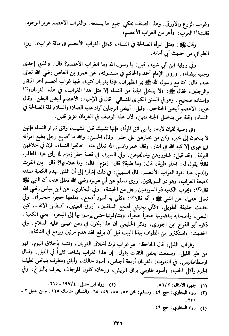 وفي رواية ابن أبي شيبة، قيل: يا رسول الله وما الغراب الأعصم؟ قال: «الذي إحدى رجليه بيضاء» . وروى الإمام أحمد والحاكم في مستدركه، عن عمرو بن العاص رضي الله تعالى عنه، قال: كنا مع رسول الله صلى الله عليه وسلم بمر الظهران، فإذا بغربان كثيرة، فيها غراب أعصم أحمر المنقار والرجلين، فقال صلى الله عليه وسلم: «لا يدخل الجنة من النساء إلا مثل هذا الغراب، في هذه الغربان» «2» وإسناده صحيح. وهو في السنن الكبرى للنسائي. قال في الإحياء: الأعصم أبيض البطن. وقال غيره: الأعصم أبيض الجناحين. وقيل: أبيض الرجلين أراد عليه الصلاة والسلام قلة الصالحة في النساء، وقلة من يدخل الجنة منهن، لأن هذا الوصف في الغربان عزيز قليل.