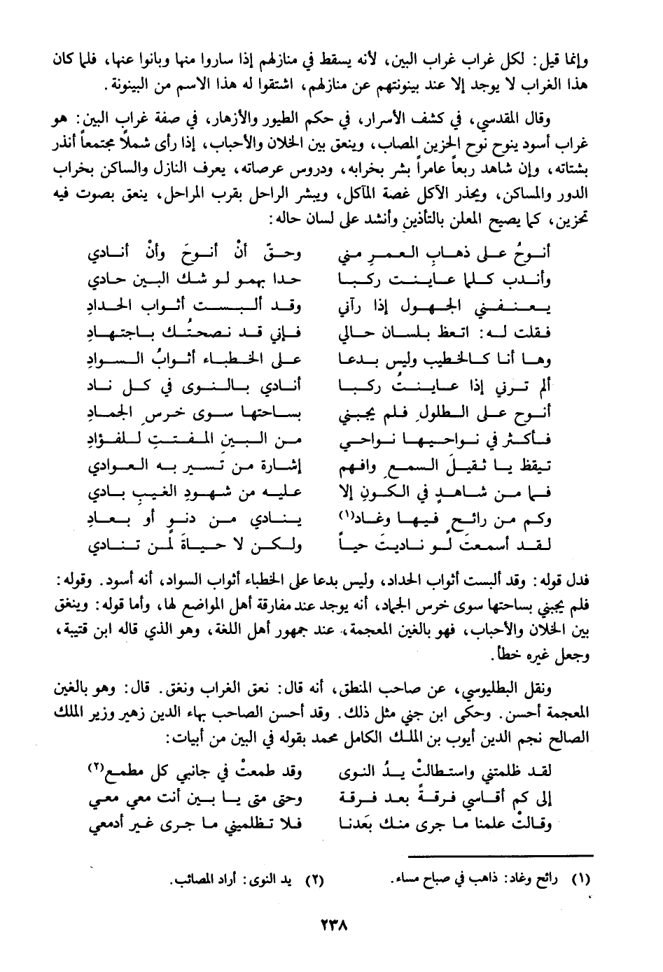 وقال المقدسي، في كشف الأسرار، في حكم الطيور والأزهار، في صفة غراب البين: هو غراب أسود ينوح نوح الحزين المصاب، وينعق بين الخلان والأحباب، إذا رأى شملا مجتمعا أنذر بشتاته، وإن شاهد ربعا عامرا بشر بخرابه، ودروس عرصاته، يعرف النازل والساكن بخراب الدور والمساكن، ويحذر الآكل غصة المآكل، ويبشر الراحل بقرب المراحل، ينعق بصوت فيه تحزين، كما يصيح المعلن بالتأذين وأنشد على لسان حاله: