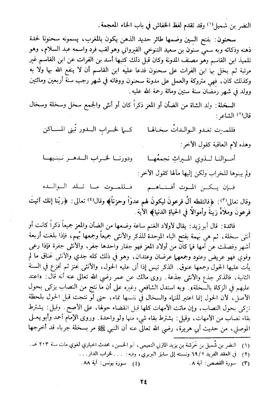 بفتح السين وضمها طائر حديد الذهن يكون بالمغرب، يسمونه سحنونا لحدة ذهنه وذكائه وبه سمي سنون بن سعيد التنوخي القيرواني وهو لقب فرد واسمه عبد السلام، وهو تلميذ ابن القاسم وهو مصنف المدونة وكان قبل ذلك كتبها أسد بن الفرات عن ابن القاسم غير مرتبة ثم بخل بها ابن الفرات على سحنون فدعا عليه ابن القاسم أن لا ينفع الله بها ولا به وكذلك كان، فهي متروكة والعمل على مدونة سحنون ووفاته في شهر رجب سنة أربعين ومائتين وولد في شهر رمضان سنة ستين ومائة رحمة الله عليه.