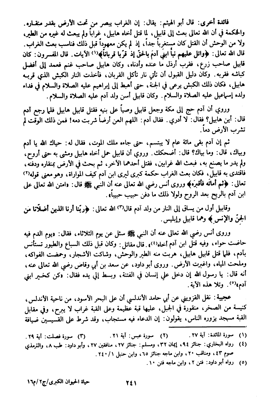 ثم إن آدم بقى مائة عام لا يبتسم، حتى جاءه ملك الموت، فقال له: حياك الله يا آدم وبياك، قال: وما بياك؟ قال: أضحكك. وروي أن قابيل حمل أخاه هابيل ومشى به حتى أروح، ولم يدر ما يصنع به، فبعث الله غرابين، فقتل أحدهما الآخر، ثم بحث في الأرض بمنقاره ودفنه، فاقتدى به قابيل، فكان بعث الغراب حكمة كبرى ليرى ابن آدم كيف المواراة، وهو معنى قوله «2» تعالى: ثُمَّ أَماتَهُ فَأَقْبَرَهُ