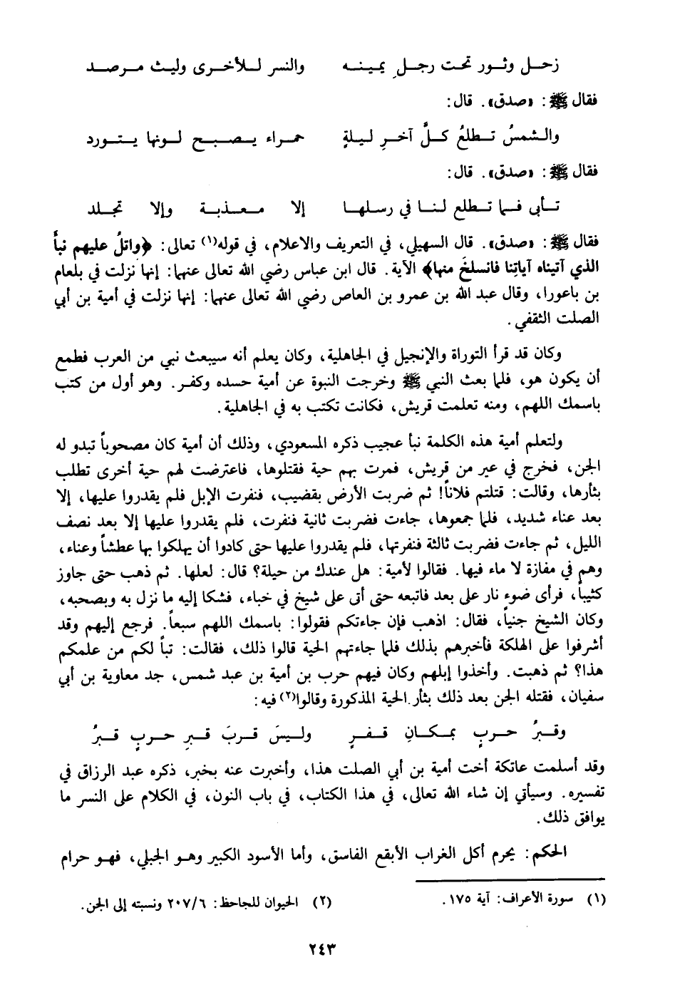 ولتعلم أمية هذه الكلمة نبأ عجيب ذكره المسعودي، وذلك أن أمية كان مصحوبا تبدو له الجن، فخرج في عير من قريش، فمرت بهم حية فقتلوها، فاعترضت لهم حية أخرى تطلب بثأرها، وقالت: قتلتم فلانا! ثم ضربت الأرض بقضيب، فنفرت الإبل فلم يقدروا عليها، إلا بعد عناء شديد، فلما جمعوها، جاءت فضربت ثانية فنفرت، فلم يقدروا عليها إلا بعد نصف الليل، ثم جاءت فضربت ثالثة فنفرتها، فلم يقدروا عليها حتى كادوا أن يهلكوا بها عطشا وعناء، وهم في مفازة لا ماء فيها. فقالوا لأمية: هل عندك من حيلة؟ قال: لعلها. ثم ذهب حتى جاوز كثيبا، فرأى ضوء نار على بعد فاتبعه حتى أتى على شيخ في خباء، فشكا إليه ما نزل به وبصحبه، وكان الشيخ جنيا، فقال: اذهب فإن جاءتكم فقولوا: باسمك اللهم سبعا. فرجع إليهم وقد أشرفوا على الهلكة فأخبرهم بذلك فلما جاءتهم الحية قالوا ذلك، فقالت: تبا لكم من علمكم هذا؟ ثم ذهبت. وأخذوا إبلهم وكان فيهم حرب بن أمية بن عبد شمس، جد معاوية بن أبي سفيان، فقتله الجن بعد ذلك بثأر الحية المذكورة وقالوا «2» فيه: