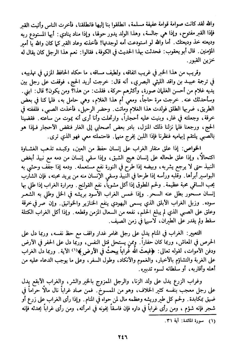«1» الآية. وربما دل الغراب على الغربة والتشاؤم بالأخبار، والغموم والأنكاد، وطول السفر، وعلى ما يوجب الدعاء عليه من أهله وأقاربه، أو سلطانه لسوء تدبيره.
