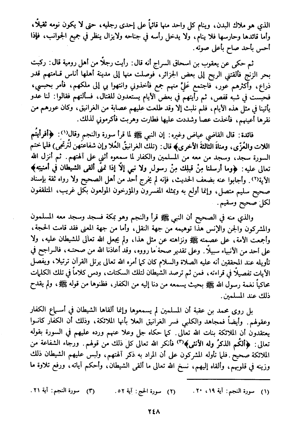 والذي منه في الصحيح أن النبي صلى الله عليه وسلم قرأ والنجم وهو بمكة فسجد وسجد معه المسلمون والمشركون والجن والإنس هذا توهيمه من جهة النقل، وأما من جهة المعنى فقد قامت الحجة، وأجمعت الأمة، على عصمته صلى الله عليه وسلم ونزاهته عن مثل هذا، ولم يجعل الله تعالى للشيطان عليه، ولا على أحد من الأنبياء سبيلا. وعلى تقدير صحة ما رووه، وقد أعاذنا الله من صحته، فالراجح في تأويله عند المحققين أنه عليه الصلاة والسلام كان كما أمره الله تعالى يرتل القرآن ترتيلا، ويفصل الآيات تفصيلا في قراءته، فمن ثم ترصد الشيطان لتلك السكتات، ودس كلاما في تلك الكلمات محاكيا نغمة رسول الله صلى الله عليه وسلم بحيث يسمعه من دنا إليه من الكفار، فظنوها من قوله صلى الله عليه وسلم، ولم يقدح ذلك عند المسلمين.