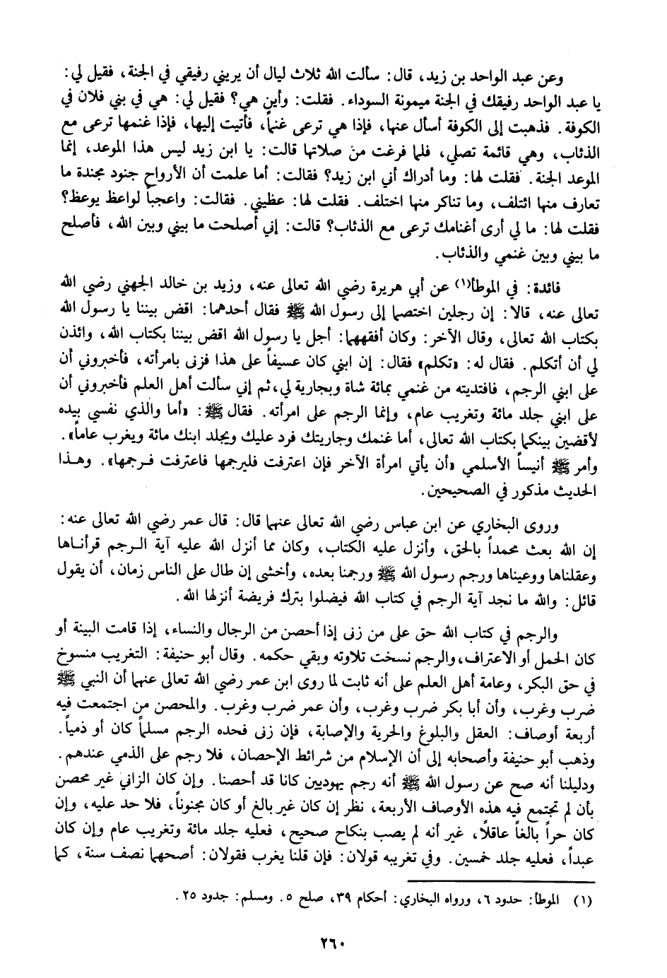 : في الموطأ «1» عن أبي هريرة رضي الله تعالى عنه، وزيد بن خالد الجهني رضي الله تعالى عنه، قالا: إن رجلين اختصما إلى رسول الله صلى الله عليه وسلم فقال أحدهما: اقض بيننا يا رسول الله بكتاب الله تعالى، وقال الآخر: وكان أفقههما: أجل يا رسول الله اقض بيننا بكتاب الله، وائذن لي أن أتكلم. فقال له: «تكلم» فقال: إن ابني كان عسيفا على هذا فزنى بامرأته، فأخبروني أن على ابني الرجم، فافتديته من غنمي بمائة شاة وبجارية لي، ثم إني سألت أهل العلم فأخبروني أن على ابني جلد مائة وتغريب عام، وإنما الرجم على امرأته. فقال صلى الله عليه وسلم: «أما والذي نفسي بيده لأقضين بينكما بكتاب الله تعالى، أما غنمك وجاريتك فرد عليك ويجلد ابنك مائة ويغرب عاما» .