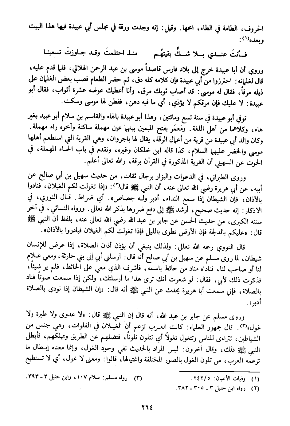 وروى الطبراني، في الدعوات والبزار برجال ثقات، من حديث سهيل بن أبي صالح عن أبيه، عن أبي هريرة رضي الله تعالى عنه، أن النبي صلى الله عليه وسلم قال «2» : «إذا تغولت لكم الغيلان، فنادوا بالأذان، فإن الشيطان إذا سمع النداء، أدبر وله جصاص» . أي ضراط. قال النووي، في الاذكار: إنه حديث صحيح، أرشد صلى الله عليه وسلم إلى دفع ضررها بذكر الله تعالى. ورواه النسائي، في آخر سننه الكبرى، من حديث الحسن عن جابر بن عبد الله رضي الله تعالى عنه، بلفظ أن النبي صلى الله عليه وسلم قال: «عليكم بالدلجة فإن الأرض تطوى بالليل فإذا تغولت لكم الغيلان فبادروا بالأذان» .