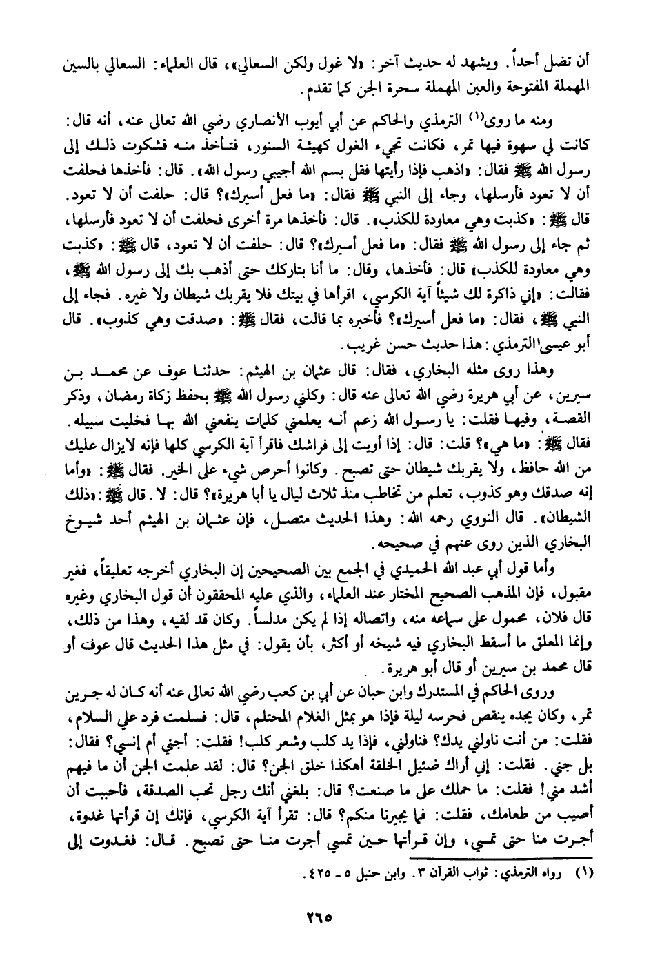 فقال صلى الله عليه وسلم: «ما هي» ؟ قلت: قال: إذا أويت إلى فراشك فاقرأ آية الكرسي كلها فإنه لا يزال عليك من الله حافظ، ولا يقربك شيطان حتى تصبح. وكانوا أحرص شيء على الخير. فقال صلى الله عليه وسلم: «وأما إنه صدقك وهو كذوب، تعلم من تخاطب منذ ثلاث ليال يا أبا هريرة» ؟ قال: لا. قال صلى الله عليه وسلم: «ذلك الشيطان» . قال النووي رحمه الله: وهذا الحديث متصل، فإن عثمان بن الهيثم أحد شيوخ البخاري الذين روى عنهم في صحيحه.