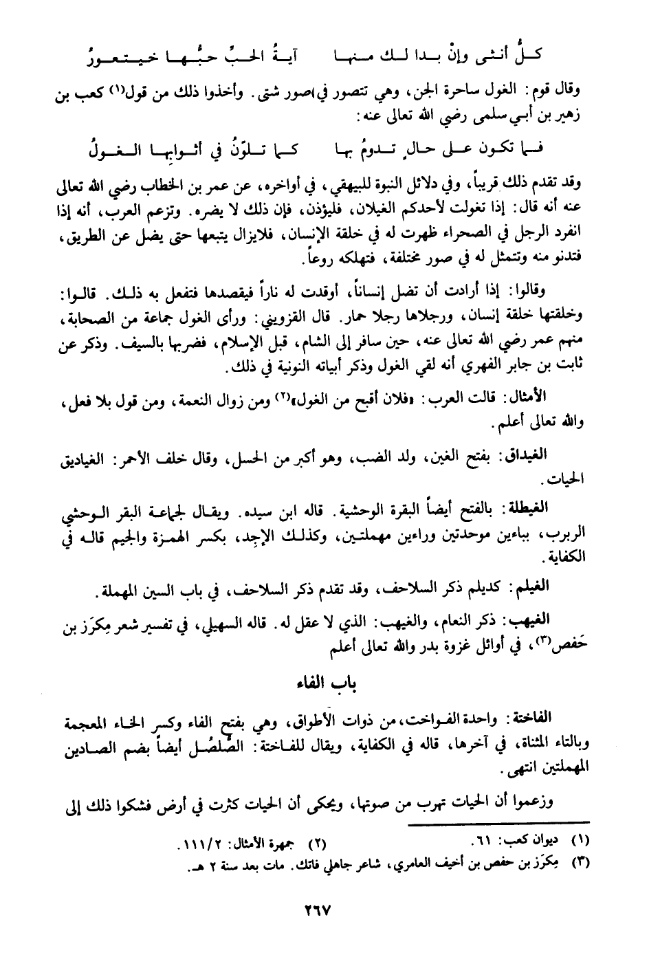 وقد تقدم ذلك قريبا، وفي دلائل النبوة للبيهقي، في أواخره، عن عمر بن الخطاب رضي الله تعالى عنه أنه قال: إذا تغولت لأحدكم الغيلان، فليؤذن، فإن ذلك لا يضره. وتزعم العرب، أنه إذا انفرد الرجل في الصحراء ظهرت له في خلقة الإنسان، فلا يزال يتبعها حتى يضل عن الطريق، فتدنو منه وتتمثل له في صور مختلفة، فتهلكه روعا.