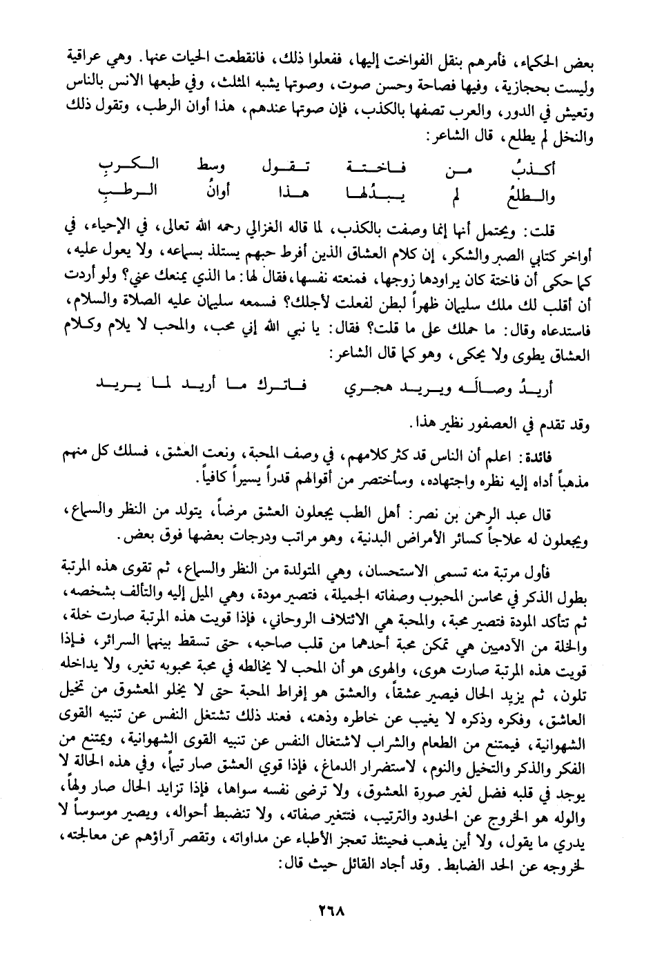 قال عبد الرحمن بن نصر: أهل الطب يجعلون العشق مرضا، يتولد من النظر والسماع، ويجعلون له علاجا كسائر الأمراض البدنية، وهو مراتب ودرجات بعضها فوق بعض.