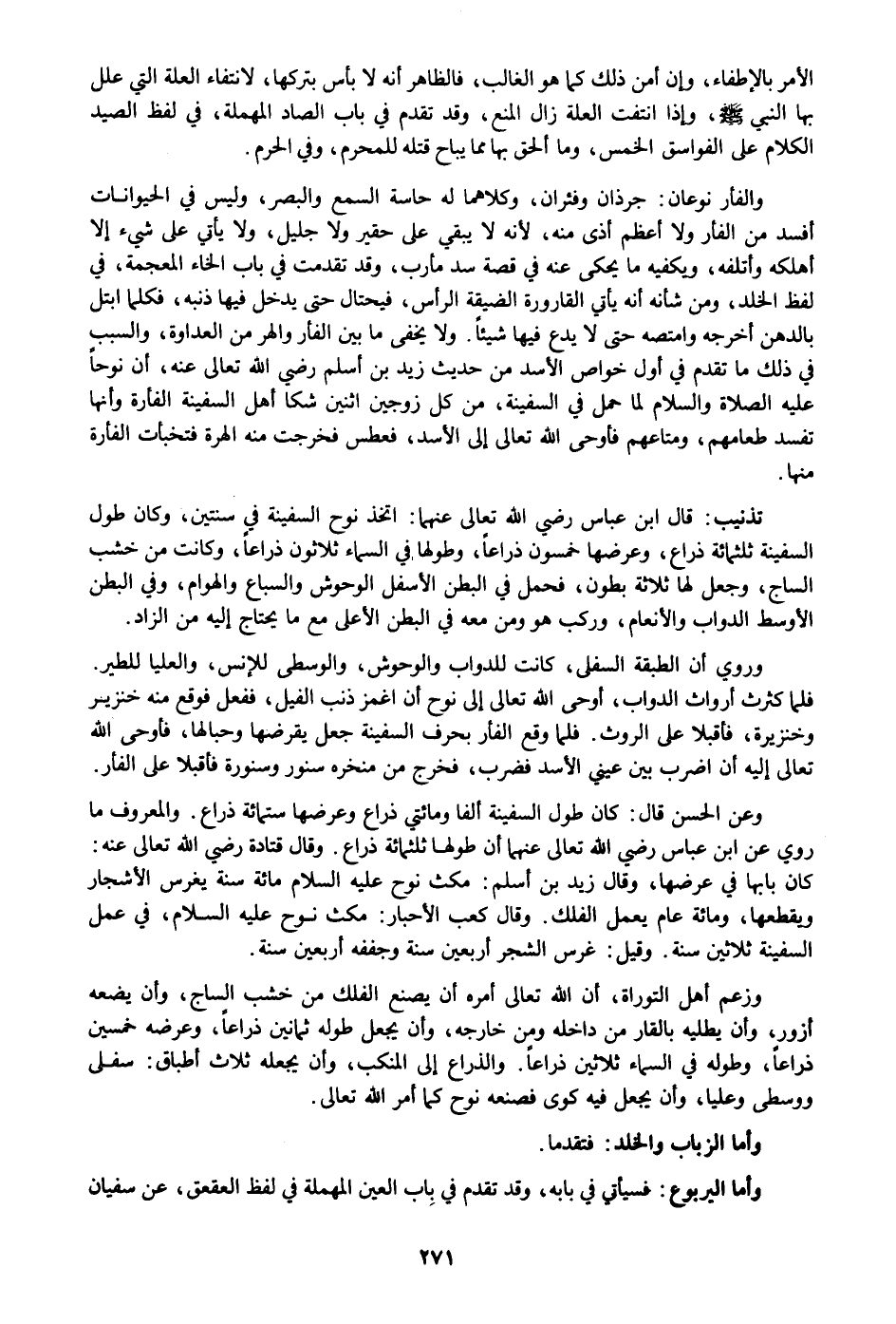 فلما كثرت أرواث الدواب، أوحى الله تعالى إلى نوح أن اغمز ذنب الفيل، ففعل فوقع منه خنزير وخنزيرة، فأقبلا على الروث. فلما وقع الفأر بحرف السفينة جعل يقرضها وحبالها، فأوحى الله تعالى إليه أن اضرب بين عيني الأسد فضرب، فخرج من منخره سنور وسنورة فأقبلا على الفأر.