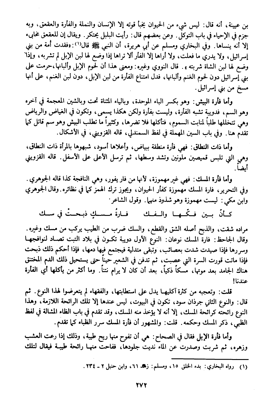 وقال الجاحظ: فارة المسك نوعان: النوع الأول دويبة تكون في بلاد التبت تصاد لنوافجها وسررها فإذا صيدت شدت بعصائب، وتبقى متدلية فيجتمع فيها دمها، فإذا أحكم ذلك ذبحت فإذا ماتت قورت السرة التي عصبت، ثم تدفن في الشعير حينا حتى يستحيل ذلك الدم المختنق هناك الجامد بعد موتها، مسكا ذكيا، بعد أن كان لا يرام نتنا. وما أكثر من يأكلها أي الفأرة عندنا! قلت: وتعجبه من كثرة آكليها يدل على استطابتها، والفقهاء لم يتعرضوا لهذا النوع. ثم قال: والنوع الثاني جرذان سود، تكون في البيوت، ليس عندها إلا تلك الرائحة اللازمة، وهذا النوع رائحته كرائحة المسك، إلا أنه لا يؤخذ منه المسك، وقد تقدم في باب الظاء المشالة في لفظ الظبي، ذكر المسك وحكمه. قلت: والمشهور أن فأرة المسك سرر الظباء كما تقدم.