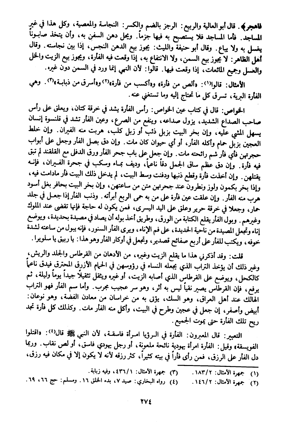 : قال في كتاب عين الخواص: رأس الفأرة يشد في خرقة كتان، ويعلق على رأس صاحب الصداع الشديد، يزول صداعه، وينفع من الصرع، وعين الفأر تشد في قلنسوة إنسان يسهل المشي عليه، وإن بخر البيت بزبل ذئب أو زبل كلب، هربت منه الفيران. وإن خلط العجين بزبل حمام وأكله الفأر، أو أي حيوان كان مات. وإن دق بصل الفأر وجعل على أبواب حجرتهن فأي فأرشم رائحته مات. وإن جعل على باب جحر الفأر ورق الدفلى مع القلقند لم تبق فيه فأرة. وإن دق عظم ساق الجمل دقا ناعما، وديف بماء وسكب في جحرة الفيران، فإنه يقتلهن. وإن أخذت فأرة وقطع ذنبها ودفنت وسط البيت، لم يدخل ذلك البيت فأر ما دامت فيه، وإذا بخر بكمون ولوز ونطرون عند جحرتهن متن من ساعتهن، وإن بخر البيت بحافر بغل أسود هرب منه الفأر. وإن علقت عين فأرة على من به حمى الربع أبرأته. وذنب الفأر إذا جعل في جلد حمار، وجعلا في خرقة حرير وعلق على اليد اليسرى، فمن يكون له حاجة فإنها تقضى عند الملوك وغيرهم. وبول الفأر يقلع الكتابة من الورق، وطريق أخذ بوله أن يصاد في مصيدة بحديدة، ويوضع إناء وتجعل المصيدة من ناحية الحديدة، على فم الإناء، ويرى الفأر السنور، فإنه يبول من ساعته لشدة خوفه، ويكتب للفأر على أربع صفائح قصدير، وتجعل في أوكار الفأر وهو هذا: يا ربيق يا سلويرا.