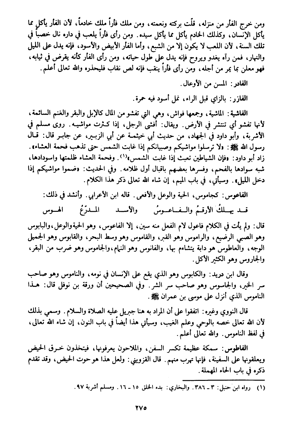 الماشية، وجمعها فواش، وهي التي تفشو من المال كالإبل والبقر والغنم السائمة، لأنها تفشو أي تنتشر في الأرض. ويقال: أفشى الرجل، إذا كثرت مواشيه. روى مسلم في الأشربة، وأبو داود في الجهاد، من حديث أبي خيثمة عن أبي الزبير، عن جابر قال: قال رسول الله صلى الله عليه وسلم: «لا ترسلوا مواشيكم وصبيانكم إذا غابت الشمس حتى تذهب فحمة العشاء» .