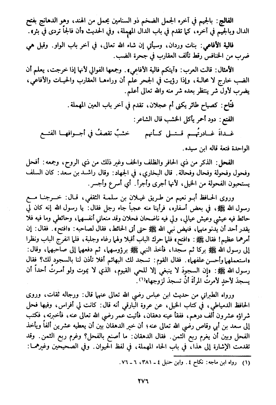 ورواه الطبراني من حديث ابن عباس رضي الله تعالى عنهما قال: ورجاله ثقات، وروى الحافظ الدمياطي، في كتاب الخيل، عن عروة البارقي أنه قال: كانت لي أفراس، وفيها فحل شراؤه عشرون ألف درهم، ففقأ عينه دهقان، فأتيت عمر رضي الله تعالى عنه، فأخبرته، فكتب إلى سعد بن أبي وقاص رضي الله تعالى عنه؛ أن خير الدهقان بين أن يعطيه عشرين ألفا ويأخذ الفحل وبين أن يغرم ربع الثمن. فقال الدهقان: ما أصنع بالفحل؟ وغرم ربع الثمن. وقد تقدمت الإشارة إلى هذا، في باب الحاء المهملة، في لفظ الحيوان. وفي الصحيحين وغيرهما: