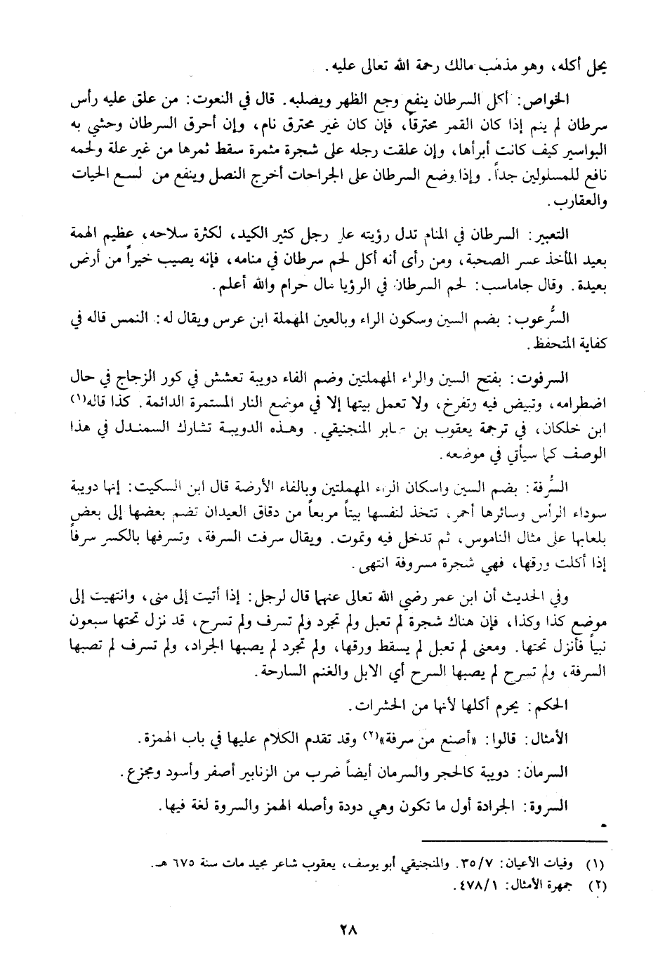 بضم السين واسكان الراء المهملتين وبالفاء الأرضة قال ابن السكيت: إنها دويبة سوداء الرأس وسائرها أحمر، تتخذ لنفسها بيتا مربعا من دقاق العيدان تضم بعضها إلى بعض بلعابها على مثال الناموس، ثم تدخل فيه وتموت. ويقال سرفت السرفة، وتسرفها بالكسر سرفا إذا أكلت ورقها، فهي شجرة مسروفة انتهى.