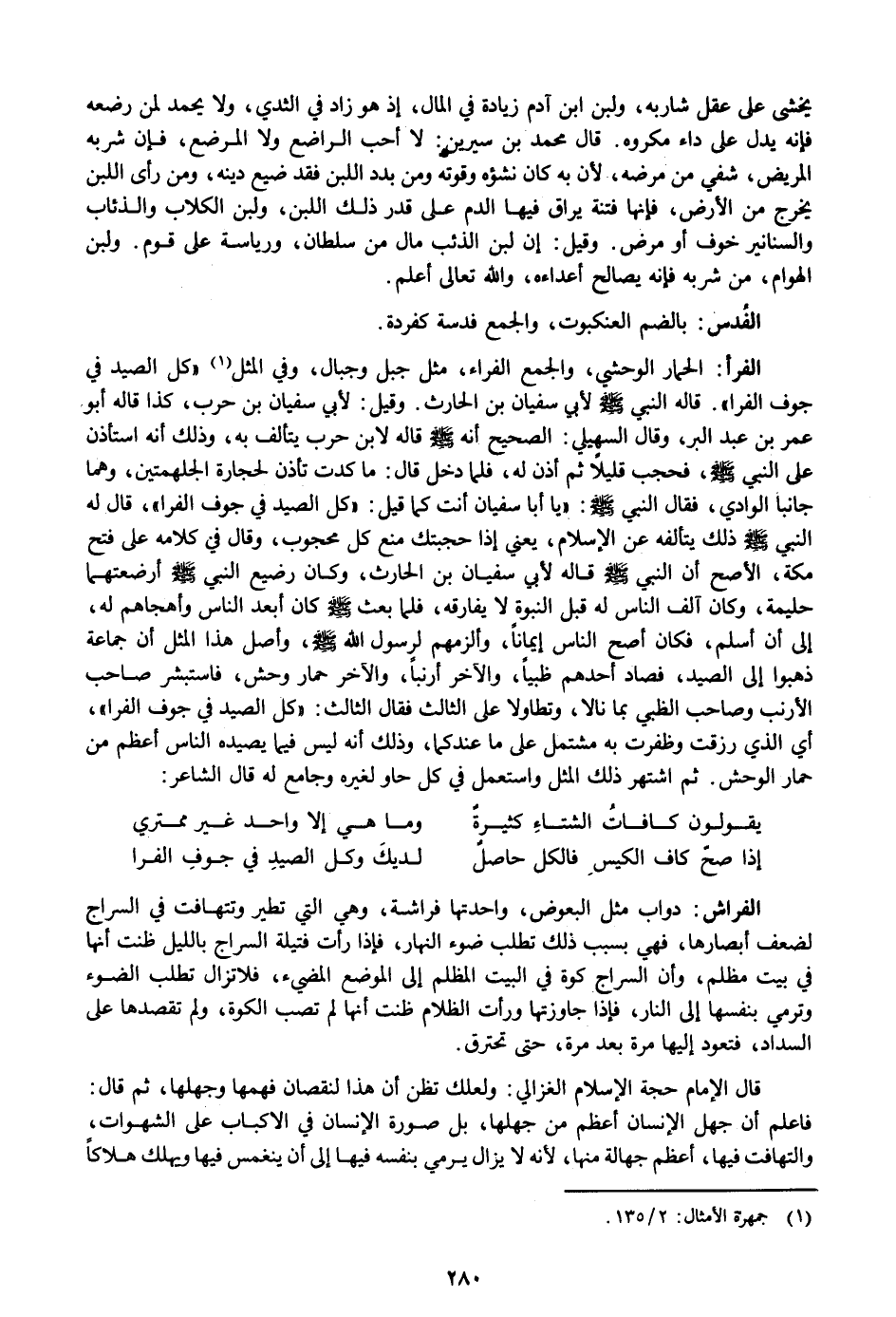 الحمار الوحشي، والجمع الفراء، مثل جبل وجبال، وفي المثل «1» «كل الصيد في جوف الفرا» . قاله النبي صلى الله عليه وسلم لأبي سفيان بن الحارث. وقيل: لأبي سفيان بن حرب، كذا قاله أبو عمر بن عبد البر، وقال السهيلي: الصحيح أنه صلى الله عليه وسلم قاله لابن حرب يتألف به، وذلك أنه استأذن على النبي صلى الله عليه وسلم، فحجب قليلا ثم أذن له، فلما دخل قال: ما كدت تأذن لحجارة الجلهمتين، وهما جانبا الوادي، فقال النبي صلى الله عليه وسلم: «يا أبا سفيان أنت كما قيل: «كل الصيد في جوف الفرا» ، قال له النبي صلى الله عليه وسلم ذلك يتألفه عن الإسلام، يعني إذا حجبتك منع كل محجوب، وقال في كلامه على فتح مكة، الأصح أن النبي صلى الله عليه وسلم قاله لأبي سفيان بن الحارث، وكان رضيع النبي صلى الله عليه وسلم أرضعتهما حليمة، وكان آلف الناس له قبل النبوة لا يفارقه، فلما بعث صلى الله عليه وسلم كان أبعد الناس وأهجاهم له، إلى أن أسلم، فكان أصح الناس إيمانا، وألزمهم لرسول الله صلى الله عليه وسلم، وأصل هذا المثل أن جماعة ذهبوا إلى الصيد، فصاد أحدهم ظبيا، والآخر أرنبا، والآخر حمار وحش، فاستبشر صاحب الأرنب وصاحب الظبي بما نالا، وتطاولا على الثالث فقال الثالث: «كل الصيد في جوف الفرا» ، أي الذي رزقت وظفرت به مشتمل على ما عندكما، وذلك أنه ليس فيما يصيده الناس أعظم من حمار الوحش. ثم اشتهر ذلك المثل واستعمل في كل حاو لغيره وجامع له قال الشاعر: