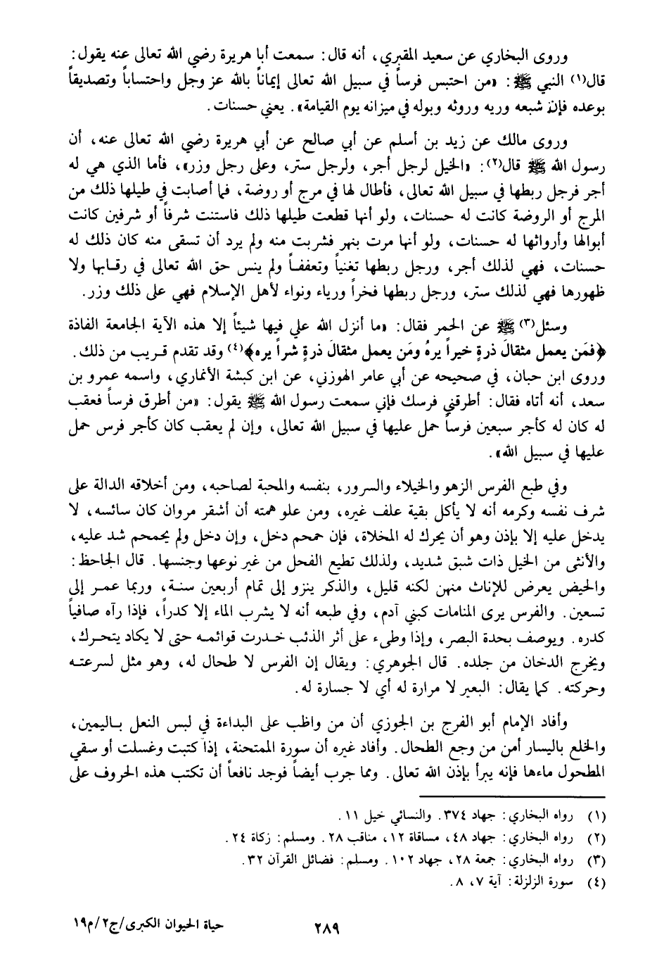 قال «1» النبي صلى الله عليه وسلم: «من احتبس فرسا في سبيل الله تعالى إيمانا بالله عز وجل واحتسابا وتصديقا بوعده فإن شبعه وريه وروثه وبوله في ميزانه يوم القيامة» . يعني حسنات.