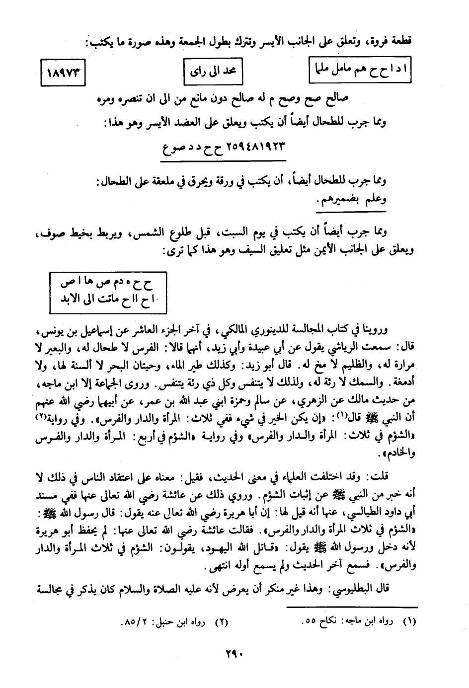 ح ح هـ د م ص ها اص اح اا ح ماتت الى الابد وروينا في كتاب المجالسة للدينوري المالكي، وفي آخر الجزء العاشر عن إسماعيل بن يونس، قال: سمعت الرياشي يقول عن أبي عبيدة وأبي زيد، أنهما قالا: الفرس لا طحال له، والبعير لا مرارة له، والظليم لا مخ له. قال أبو زيد: وكذلك طير الماء، وحيتان البحر لا ألسنة لها، ولا أدمغة. والسمك لا رئة له، ولذلك لا يتنفس وكل ذي رئة يتنفس. وروى الجماعة إلا ابن ماجه، من حديث مالك عن الزهري، عن سالم وحمزة ابني عبد الله بن عمر، عن أبيهما رضي الله عنهم أن النبي صلى الله عليه وسلم قال «1» : «إن يكن الخير في شيء ففي ثلاث: المرأة والدار والفرس» . وفي رواية «2» «الشؤم في ثلاث: المرأة والدار والفرس» وفي رواية «الشؤم في أربع: المرأة والدار والفرس والخادم» .