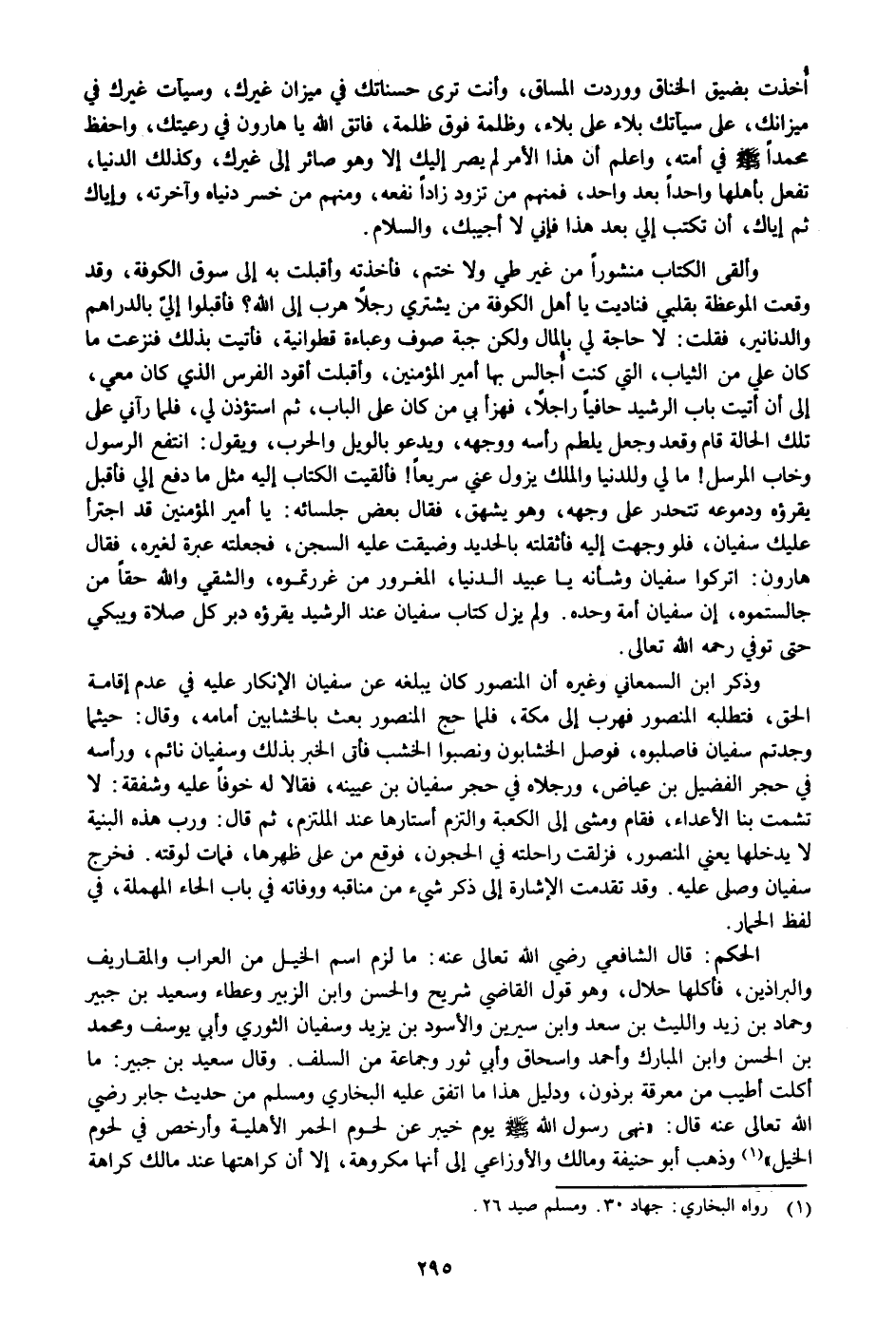 وألقى الكتاب منشورا من غير طي ولا ختم، فأخذته وأقبلت به إلى سوق الكوفة، وقد وقعت الموعظة بقلبي فناديت يا أهل الكوفة من يشتري رجلا هرب إلى الله؟ فأقبلوا إليّ بالدراهم والدنانير، فقلت: لا حاجة لي بالمال ولكن جبة صوف وعباءة قطوانية، فأتيت بذلك فنزعت ما كان علي من الثياب، التي كنت أجالس بها أمير المؤمنين، وأقبلت أقود الفرس الذي كان معي، إلى أن أتيت باب الرشيد حافيا راجلا، فهزأ بي من كان على الباب، ثم استؤذن لي، فلما رآني على تلك الحالة قام وقعد وجعل يلطم رأسه ووجهه، ويدعو بالويل والحرب، ويقول: انتفع الرسول وخاب المرسل! ما لي وللدنيا والملك يزول عني سريعا! فألقيت الكتاب إليه مثل ما دفع إلي فأقبل يقرؤه ودموعه تتحدر على وجهه، وهو يشهق، فقال بعض جلسائه: يا أمير المؤمنين قد اجترأ عليك سفيان، فلو وجهت إليه فأثقلته بالحديد وضيقت عليه السجن، فجعلته عبرة لغيره، فقال هارون: اتركوا سفيان وشأنه يا عبيد الدنيا، المغرور من غررتموه، والشقي والله حقا من جالستموه، إن سفيان أمة وحده. ولم يزل كتاب سفيان عند الرشيد يقرؤه دبر كل صلاة ويبكي حتى توفي رحمه الله تعالى.