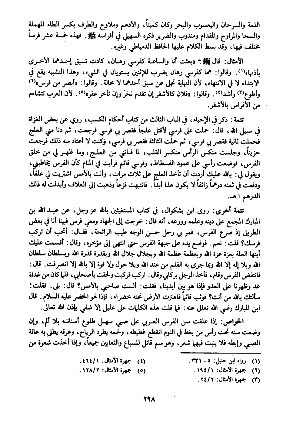 : ذكر في الإحياء، في الباب الثالث من كتاب أحكام الكسب، روي عن بعض الغزاة في سبيل الله، قال: حملت على فرسي لأقتل علجا فقصر بي فرسي فرجعت، ثم دنا مني العلج فحملت ثانية فقصر بي فرسي، ثم حملت الثالثة فقصر بي فرسي، وكنت لا أعتاد منه ذلك فرجعت حزينا، وجلست منكس الرأس منكسر القلب، لما فاتني من العلج، وما ظهر لي من خلق الفرس، فوضعت رأسي على عمود الفسطاط، وفرسي قائم فرأيت في المنام كأن الفرس يخاطبني، ويقول لي: بالله عليك أردت أن تأخذ العلج على ثلاث مرات، وأنت بالأمس اشتريت لي علفا، ودفعت في ثمنه درهما زائفا لا يكون هذا أبدا. فانتبهت فزعا وذهبت إلى العلاف وأبدلت له ذلك الدرهم اهـ.