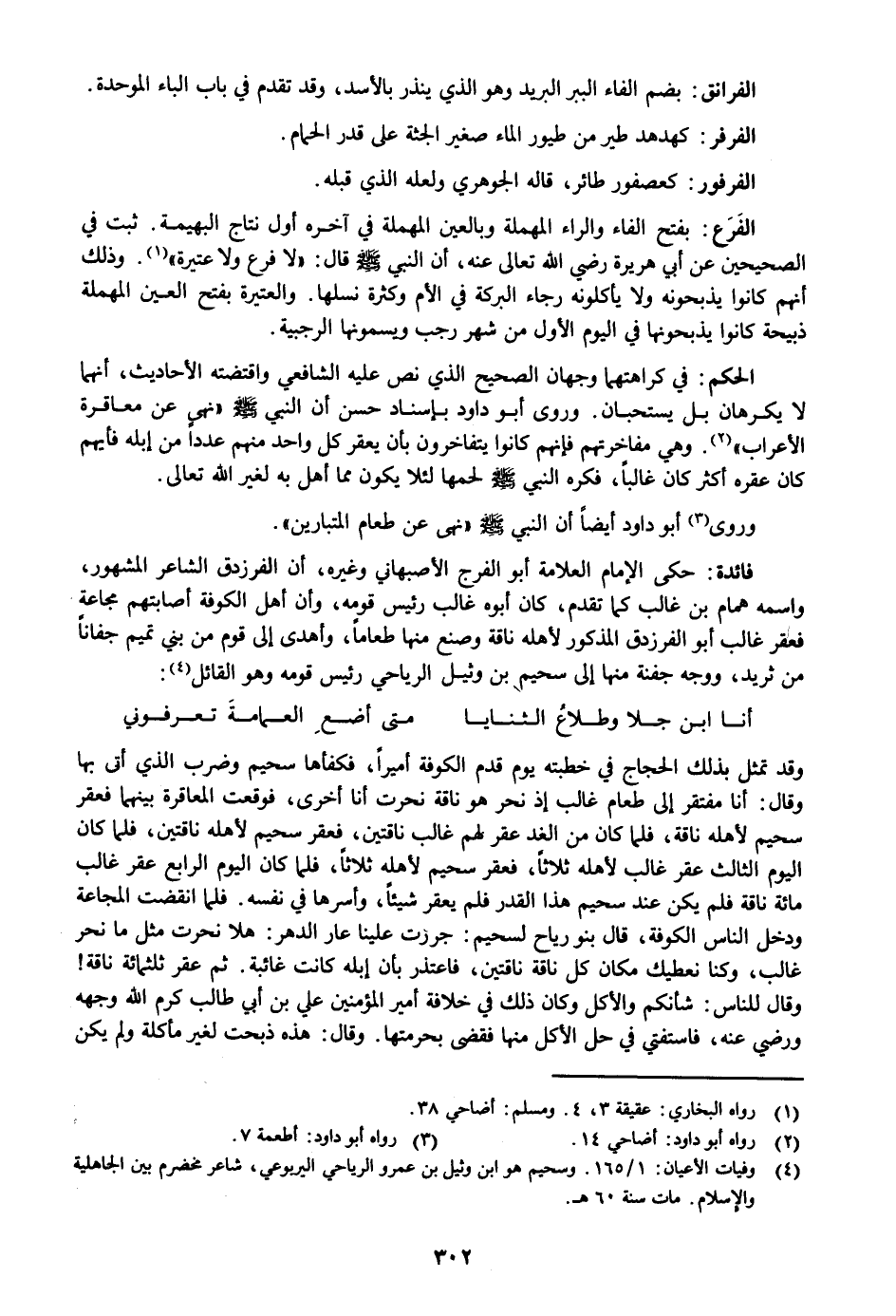 : بفتح الفاء والراء المهملة وبالعين المهملة في آخره أول نتاج البهيمة. ثبت في الصحيحين عن أبي هريرة رضي الله تعالى عنه، أن النبي صلى الله عليه وسلم قال: «لا فرع ولا عتيرة» «1» . وذلك أنهم كانوا يذبحونه ولا يأكلونه رجاء البركة في الأم وكثرة نسلها. والعتيرة بفتح العين المهملة ذبيحة كانوا يذبحونها في اليوم الأول من شهر رجب ويسمونها الرجبية.