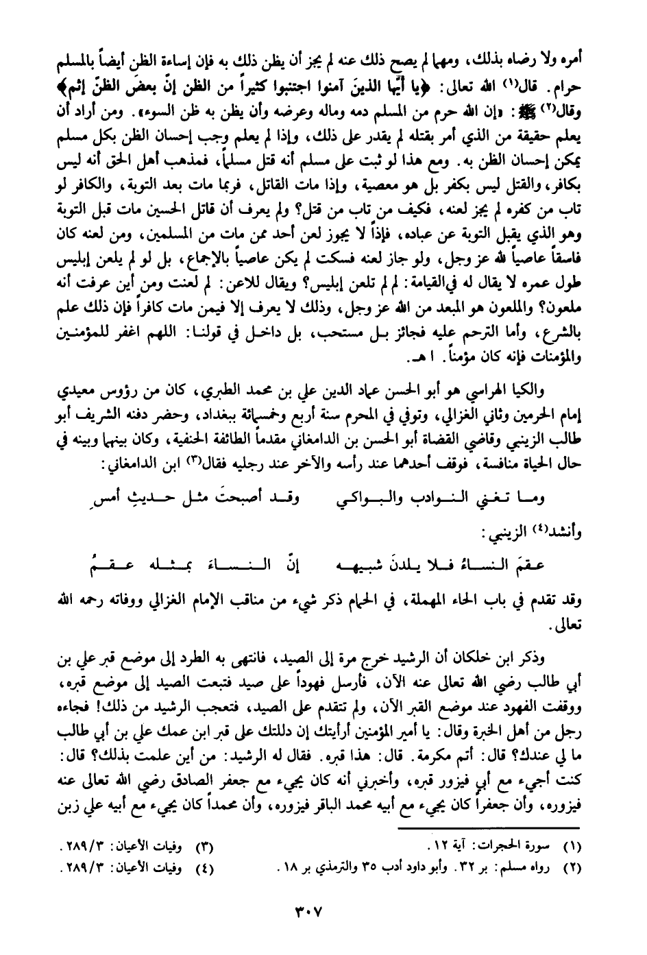 وقال «2» صلى الله عليه وسلم: «إن الله حرم من المسلم دمه وماله وعرضه وأن يظن به ظن السوء» . ومن أراد أن يعلم حقيقة من الذي أمر بقتله لم يقدر على ذلك، وإذا لم يعلم وجب إحسان الظن بكل مسلم يمكن إحسان الظن به. ومع هذا لو ثبت على مسلم أنه قتل مسلما، فمذهب أهل الحق أنه ليس بكافر، والقتل ليس بكفر بل هو معصية، وإذا مات القاتل، فربما مات بعد التوبة، والكافر لو تاب من كفره لم يجز لعنه، فكيف من تاب من قتل؟ ولم يعرف أن قاتل الحسين مات قبل التوبة وهو الذي يقبل التوبة عن عباده، فإذا لا يجوز لعن أحد ممن مات من المسلمين، ومن لعنه كان فاسقا عاصيا لله عز وجل، ولو جاز لعنه فسكت لم يكن عاصيا بالإجماع، بل لو لم يلعن إبليس طول عمره لا يقال له في القيامة: لم لم تلعن إبليس؟ ويقال للاعن: لم لعنت ومن أين عرفت أنه ملعون؟ والملعون هو المبعد من الله عز وجل، وذلك لا يعرف إلا فيمن مات كافرا فإن ذلك علم بالشرع، وأما الترحم عليه فجائز بل مستحب، بل داخل في قولنا: اللهم اغفر للمؤمنين والمؤمنات فإنه كان مؤمنا. اهـ.