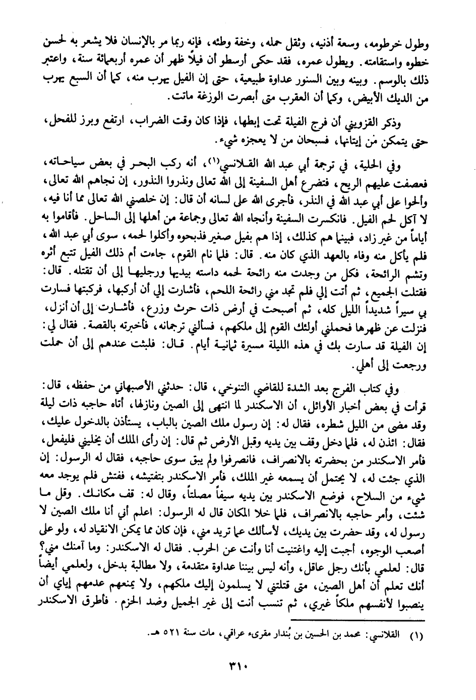 وفي الحلية، في ترجمة أبي عبد الله القلانسي «1» ، أنه ركب البحر في بعض سياحاته، فعصفت عليهم الريح، فتضرع أهل السفينة إلى الله تعالى ونذروا النذور، إن نجاهم الله تعالى، وألحوا على أبي عبد الله في النذر، فأجرى الله على لسانه أن قال: إن خلصني الله تعالى مما أنا فيه، لا آكل لحم الفيل. فانكسرت السفينة وأنجاه الله تعالى وجماعة من أهلها إلى الساحل. فأقاموا به أياما من غير زاد، فبينما هم كذلك، إذا هم بفيل صغير فذبحوه وأكلوا لحمه، سوى أبي عبد الله، فلم يأكل منه وفاء بالعهد الذي كان منه. قال: فلما نام القوم، جاءت أم ذلك الفيل تتبع أثره وتشم الرائحة، فكل من وجدت منه رائحة لحمه داسته بيديها ورجليها إلى أن تقتله. قال: