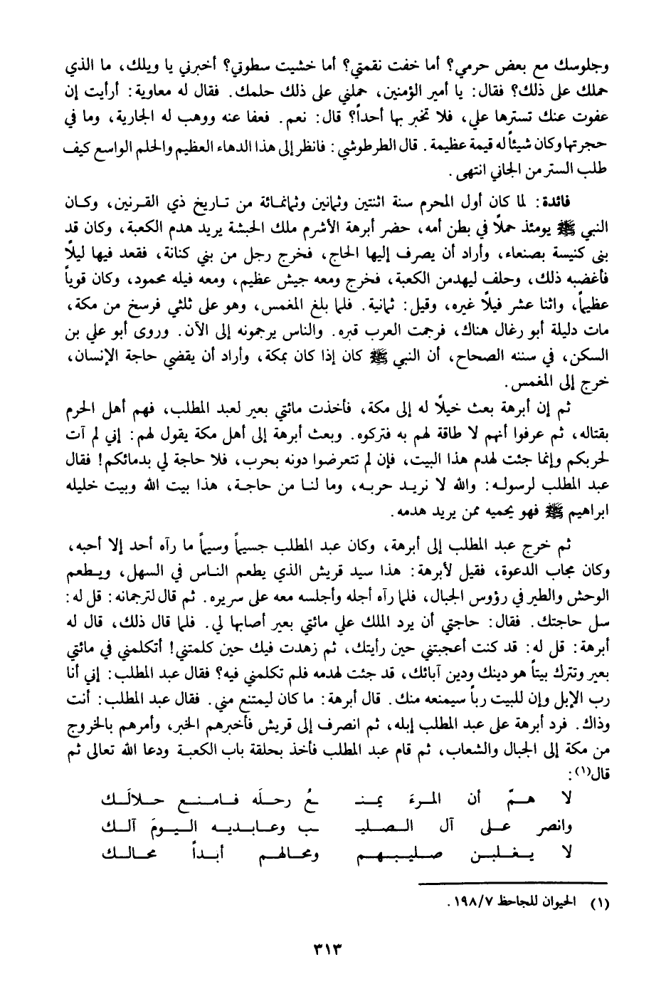 سل حاجتك. فقال: حاجتي أن يرد الملك علي مائتي بعير أصابها لي. فلما قال ذلك، قال له أبرهة: قل له: قد كنت أعجبتني حين رأيتك، ثم زهدت فيك حين كلمتني! أتكلمني في مائتي بعير وتترك بيتا هو دينك ودين آبائك، قد جئت لهدمه فلم تكلمني فيه؟ فقال عبد المطلب: إني أنا رب الإبل وإن للبيت ربا سيمنعه منك. قال أبرهة: ما كان ليمتنع مني. فقال عبد المطلب: أنت وذاك. فرد أبرهة على عبد المطلب إبله، ثم انصرف إلى قريش فأخبرهم الخبر، وأمرهم بالخروج من مكة إلى الجبال والشعاب، ثم قام عبد المطلب فأخذ بحلقة باب الكعبة ودعا الله تعالى ثم قال «1» :
