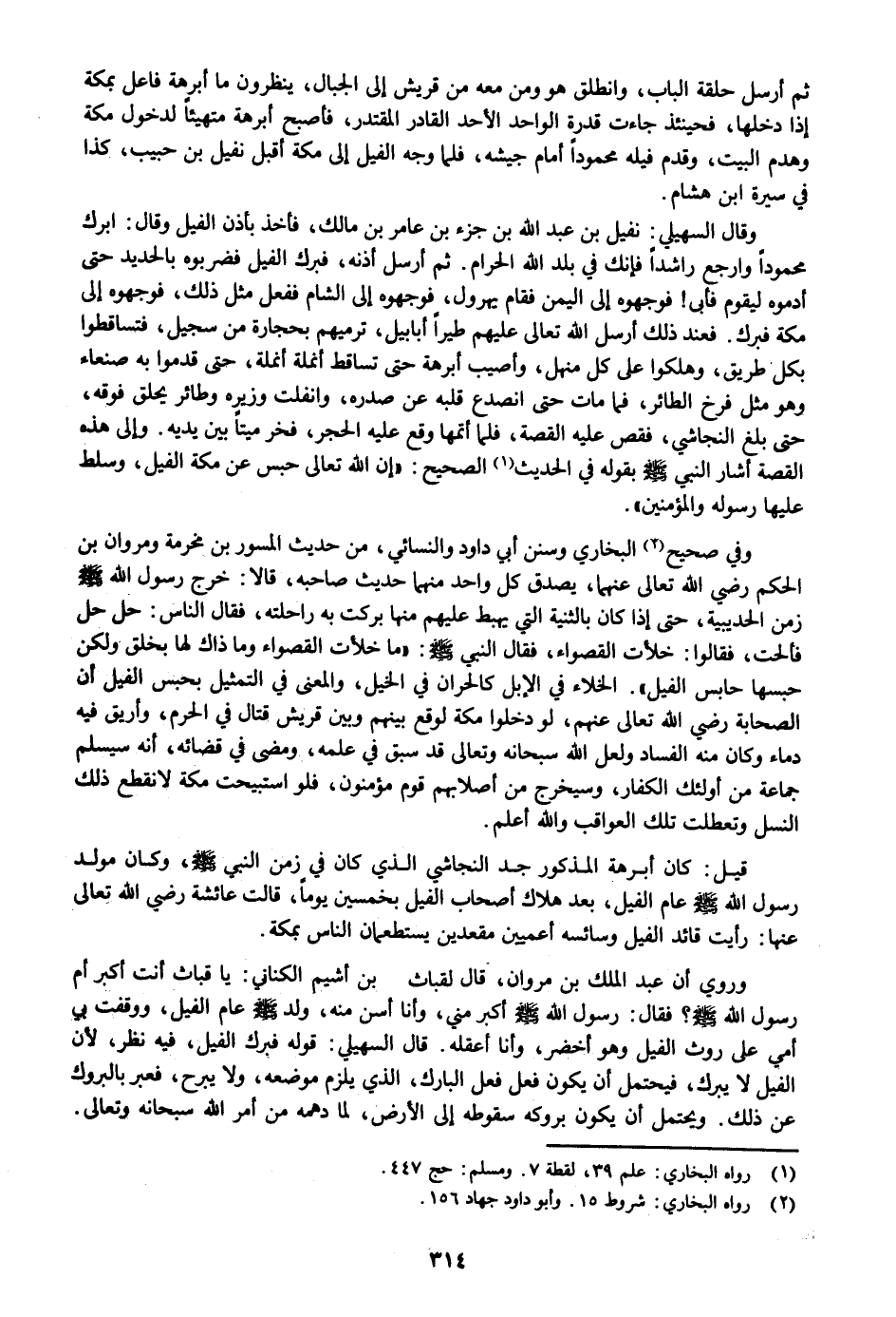 وقال السهيلي: نفيل بن عبد الله بن جزء بن عامر بن مالك، فأخذ بأذن الفيل وقال: ابرك محمودا وارجع راشدا فإنك في بلد الله الحرام. ثم أرسل أذنه، فبرك الفيل فضربوه بالحديد حتى أدموه ليقوم فأبى! فوجهوه إلى اليمن فقام يهرول، فوجهوه إلى الشام ففعل مثل ذلك، فوجهوه إلى مكة فبرك. فعند ذلك أرسل الله تعالى عليهم طيرا أبابيل، ترميهم بحجارة من سجيل، فتساقطوا بكل طريق، وهلكوا على كل منهل، وأصيب أبرهة حتى تساقط أنملة أنملة، حتى قدموا به صنعاء وهو مثل فرخ الطائر، فما مات حتى انصدع قلبه عن صدره، وانفلت وزيره وطائر يحلق فوقه، حتى بلغ النجاشي، فقص عليه القصة، فلما أتمها وقع عليه الحجر، فخر ميتا بين يديه. وإلى هذه القصة أشار النبي صلى الله عليه وسلم بقوله في الحديث «1» الصحيح: «إن الله تعالى حبس عن مكة الفيل، وسلط عليها رسوله والمؤمنين» .