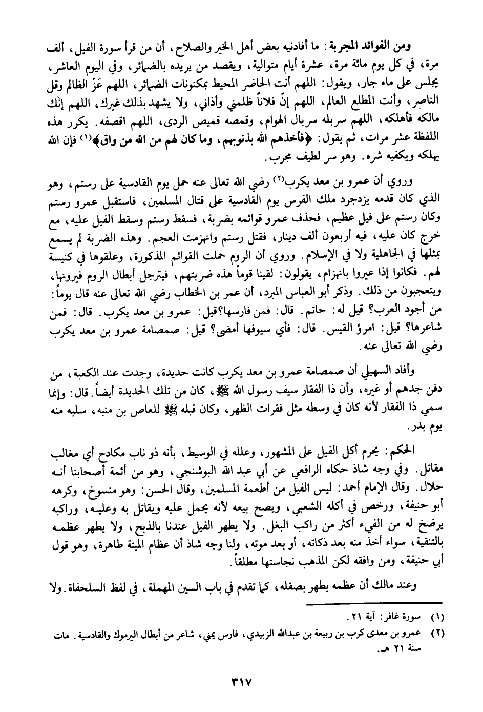 وروي أن عمرو بن معد يكرب «2» رضي الله تعالى عنه حمل يوم القادسية على رستم، وهو الذي كان قدمه يزدجرد ملك الفرس يوم القادسية على قتال المسلمين، فاستقبل عمرو رستم وكان رستم على فيل عظيم، فحذف عمرو قوائمه بضربة، فسقط رستم وسقط الفيل عليه، مع خرج كان عليه، فيه أربعون ألف دينار، فقتل رستم وانهزمت العجم. وهذه الضربة لم يسمع بمثلها في الجاهلية ولا في الإسلام. وروي أن الروم حملت القوائم المذكورة، وعلقوها في كنيسة لهم. فكانوا إذا عيروا بانهزام، يقولون: لقينا قوما هذه ضربتهم، فيترجل أبطال الروم فيرونها، ويتعجبون من ذلك. وذكر أبو العباس المبرد، أن عمر بن الخطاب رضي الله تعالى عنه قال يوما: