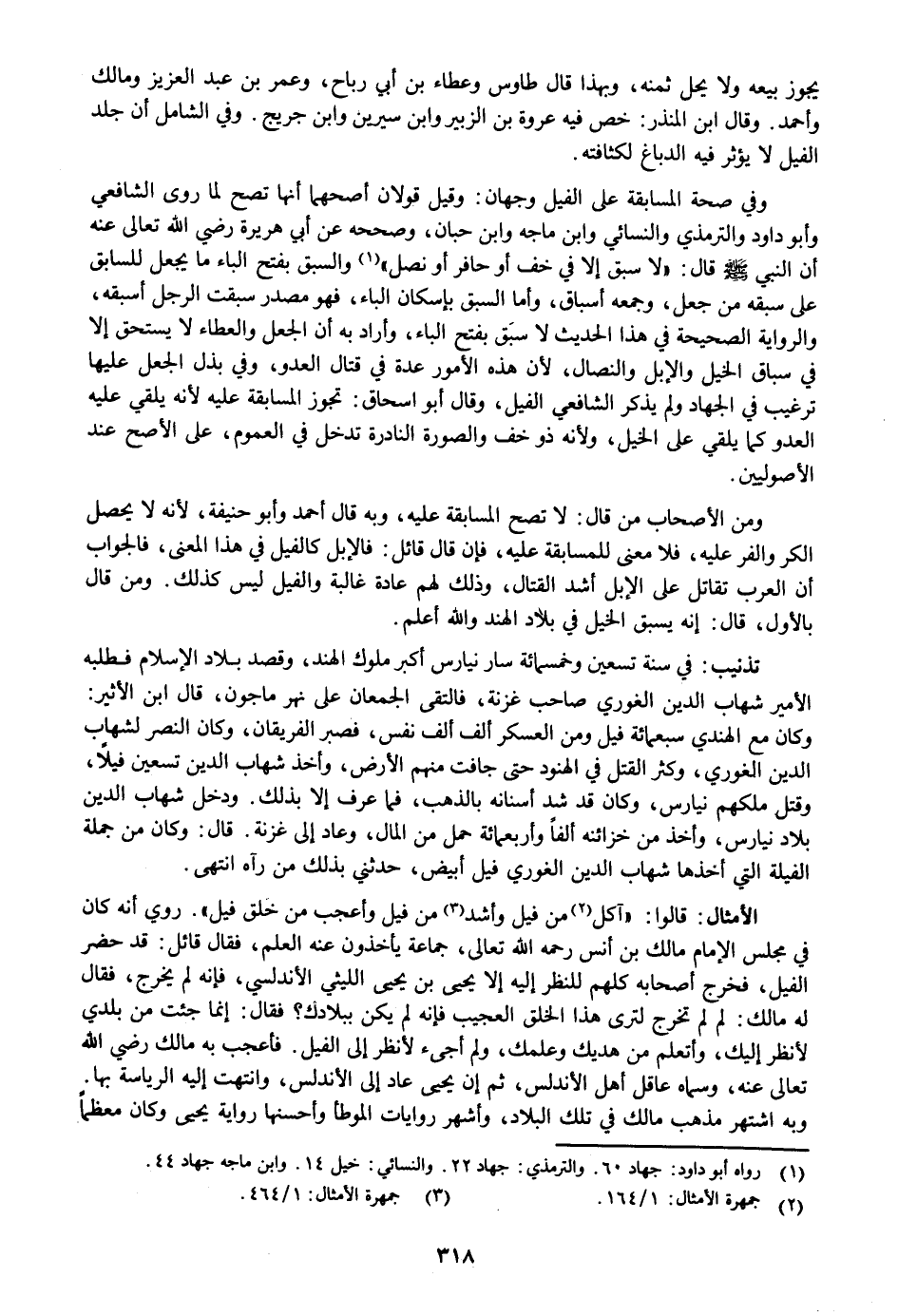 وفي صحة المسابقة على الفيل وجهان: وقيل قولان أصحهما أنها تصح لما روى الشافعي وأبو داود والترمذي والنسائي وابن ماجه وابن حبان، وصححه عن أبي هريرة رضي الله تعالى عنه أن النبي صلى الله عليه وسلم قال: «لا سبق إلا في خف أو حافر أو نصل» «1» والسبق بفتح الباء ما يجعل للسابق على سبقه من جعل، وجمعه أسباق، وأما السبق بإسكان الباء، فهو مصدر سبقت الرجل أسبقه، والرواية الصحيحة في هذا الحديث لا سبق بفتح الباء، وأراد به أن الجعل والعطاء لا يستحق إلا في سباق الخيل والإبل والنصال، لأن هذه الأمور عدة في قتال العدو، وفي بذل الجعل عليها ترغيب في الجهاد ولم يذكر الشافعي الفيل، وقال أبو اسحاق: تجوز المسابقة عليه لأنه يلقي عليه العدو كما يلقي على الخيل، ولأنه ذو خف والصورة النادرة تدخل في العموم، على الأصح عند الأصوليين.