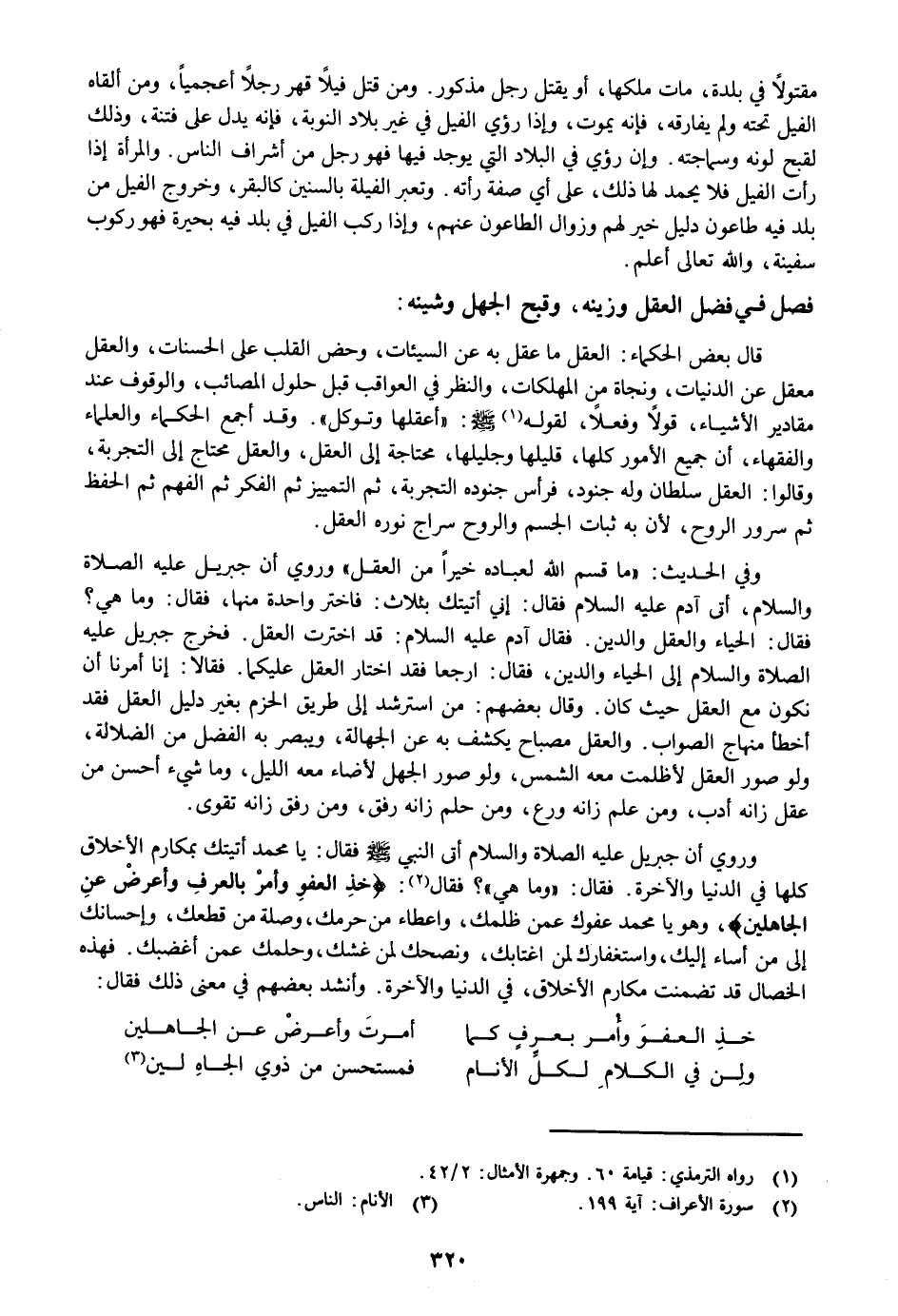فقال: الحياء والعقل والدين. فقال آدم عليه السلام: قد اخترت العقل. فخرج جبريل عليه الصلاة والسلام إلى الحياء والدين، فقال: ارجعا فقد اختار العقل عليكما. فقالا: إنا أمرنا أن نكون مع العقل حيث كان. وقال بعضهم: من استرشد إلى طريق الحزم بغير دليل العقل فقد أخطأ منهاج الصواب. والعقل مصباح يكشف به عن الجهالة، ويبصر به الفضل من الضلالة، ولو صور العقل لأظلمت معه الشمس، ولو صور الجهل لأضاء معه الليل، وما شيء أحسن من عقل زانه أدب، ومن علم زانه ورع، ومن حلم زانه رفق، ومن رفق زانه تقوى.