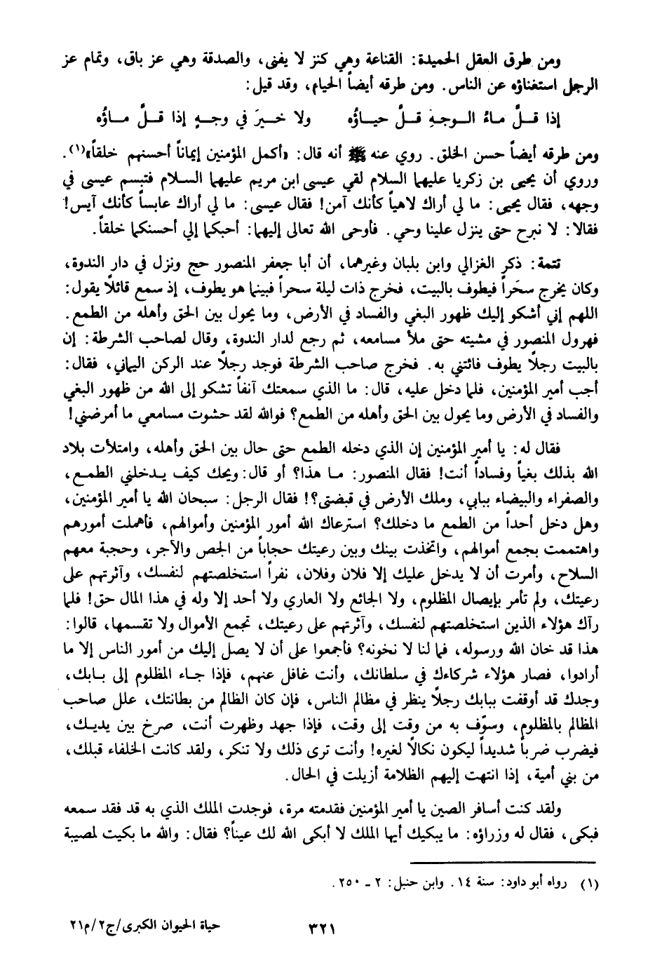 أجب أمير المؤمنين، فلما دخل عليه، قال: ما الذي سمعتك آنفا تشكو إلى الله من ظهور البغي والفساد في الأرض وما يحول بين الحق وأهله من الطمع؟ فو الله لقد حشوت مسامعي ما أمرضني! فقال له: يا أمير المؤمنين إن الذي دخله الطمع حتى حال بين الحق وأهله، وامتلأت بلاد الله بذلك بغيا وفسادا أنت! فقال المنصور: ما هذا؟ أو قال: ويحك كيف يدخلني الطمع، والصفراء والبيضاء ببابي، وملك الأرض في قبضتى؟! فقال الرجل: سبحان الله يا أمير المؤمنين، وهل دخل أحدا من الطمع ما دخلك؟ استرعاك الله أمور المؤمنين وأموالهم، فأهملت أمورهم واهتممت بجمع أموالهم، واتخذت بينك وبين رعيتك حجابا من الجص والآجر، وحجبة معهم السلاح، وأمرت أن لا يدخل عليك إلا فلان وفلان، نفرا استخلصتهم لنفسك، وآثرتهم على رعيتك، ولم تأمر بإيصال المظلوم، ولا الجائع ولا العاري ولا أحد إلا وله في هذا المال حق! فلما رآك هؤلاء الذين استخلصتهم لنفسك، وآثرتهم على رعيتك، تجمع الأموال ولا تقسمها، قالوا: