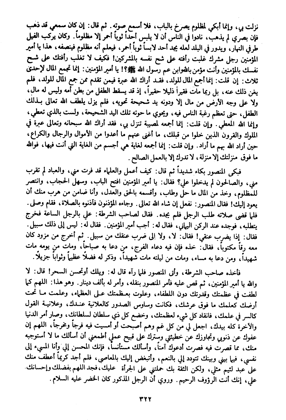نزلت بي، وإنما أبكي لمظلوم يصرخ بالباب، فلا أسمع صوته. ثم قال: إن كان سمعي قد ذهب فإن بصري لم يذهب، نادوا في الناس أن لا يلبس أحدا ثوبا أحمر إلا مظلوما. وكان يركب الفيل طرفي النهار، ويدور في البلد لعله يجد أحد لابسا ثوبا أحمر، فيعلم أنه مظلوم فينصفه، هذا يا أمير المؤمنين رجل مشرك غلبت رأفته على شح نفسه بالمشركين! فكيف لا تغلب رأفتك على شح نفسك بالمؤمنين وأنت مؤمن بالله وابن عم رسول الله صلى الله عليه وسلم؟! يا أمير المؤمنين: إنما تجمع المال لإحدى ثلاث: إن قلت: إنما أجمع المال للولد، فقد أراك الله عبرة فيمن تقدم ممن جمع المال للولد، فلم يغن ذلك عنه، بل ربما مات فقيرا ذليلا حقيرا، إذ قد يسقط الطفل من بطن أمه وليس له مال، ولا على وجه الأرض من مال إلا ودونه يد شحيحة تحويه، فلم يزل يلطف الله تعالى بذلك الطفل، حتى تعظم رغبة الناس فيه، ويحوي ما حوته تلك اليد الشحيحة، ولست بالذي تعطي، وإنما الله المعطي. وإن قلت: إنما أجمعه لمصيبة تنزل بي، فقد أراك الله سبحانه وتعالى عبرة في الملوك والقرون الذين خلوا من قبلك، ما أغنى عنهم ما أعدوا من الأموال والرجال والكراع، حين أراد الله بهم ما أراد. وإن قلت: إنما أجمعه لغاية هي أجسم من الغاية التي أنت فيها، فو الله ما فوق منزلتك إلا منزلة، لا تدرك إلا بالعمل الصالح.