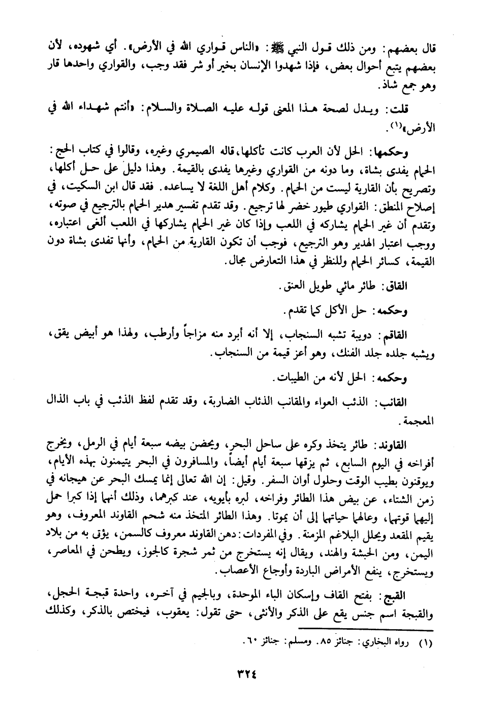 الحمام يفدى بشاة، وما دونه من القواري وغيرها يفدى بالقيمة. وهذا دليل على حل أكلها، وتصريح بأن القارية ليست من الحمام. وكلام أهل اللغة لا يساعده. فقد قال ابن السكيت، في إصلاح المنطق: القواري طيور خضر لها ترجيع. وقد تقدم تفسير هدير الحمام بالترجيع في صوته، وتقدم أن غير الحمام يشاركه في اللعب وإذا كان غير الحمام يشاركها في اللعب ألغى اعتباره، ووجب اعتبار الهدير وهو الترجيع، فوجب أن تكون القارية من الحمام، وأنها تفدى بشاة دون القيمة، كسائر الحمام وللنظر في هذا التعارض مجال.