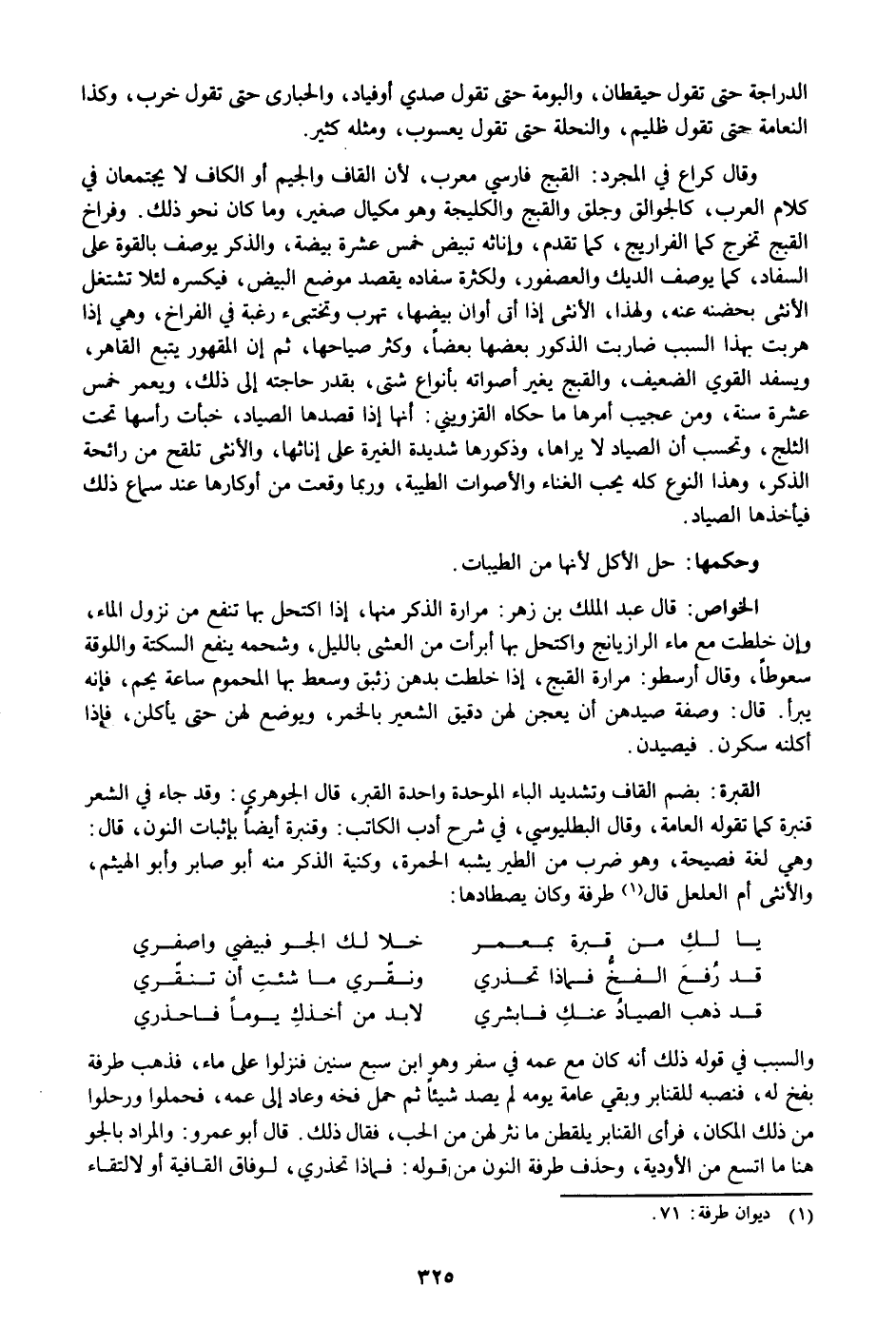 وقال كراع في المجرد: القبج فارسي معرب، لأن القاف والجيم أو الكاف لا يجتمعان في كلام العرب، كالجوالق وجلق والقبج والكليجة وهو مكيال صغير، وما كان نحو ذلك. وفراخ القبج تخرج كما الفراريج، كما تقدم، وإناثه تبيض خمس عشرة بيضة، والذكر يوصف بالقوة على السفاد، كما يوصف الديك والعصفور، ولكثرة سفاده يقصد موضع البيض، فيكسره لئلا تشتغل الأنثى بحضنه عنه، ولهذا، الأنثى إذا أتى أوان بيضها، تهرب وتختبىء رغبة في الفراخ، وهي إذا هربت بهذا السبب ضاربت الذكور بعضها بعضا، وكثر صياحها، ثم إن المقهور يتبع القاهر، ويسفد القوي الضعيف، والقبج يغير أصواته بأنواع شتى، بقدر حاجته إلى ذلك، ويعمر خمس عشرة سنة، ومن عجيب أمرها ما حكاه القزويني: أنها إذا قصدها الصياد، خبأت رأسها تحت الثلج، وتحسب أن الصياد لا يراها، وذكورها شديدة الغيرة على إناثها، والأنثى تلقح من رائحة الذكر، وهذا النوع كله يحب الغناء والأصوات الطيبة، وربما وقعت من أوكارها عند سماع ذلك فيأخذها الصياد.