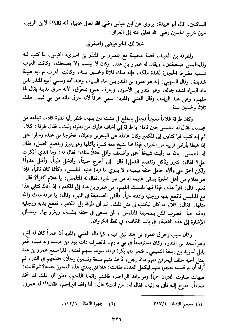 نعم. قال: اقرأ هذه، فإذا فيها باسمك اللهم، من عمرو بن هند إلى المكعبر، إذا أتاك كتابي هذا مع المتلمس فاقطع يديه ورجليه وادفنه حيا. فألقى الصحيفة في النهر، وقال: يا طرفة معك والله مثلها. فقال: كلا، ما كان ليكتب لي مثل ذلك. ثم أتى طرفة إلى المكعبر، فقطع يديه ورجليه ودفنه حيا. فضرب المثل بصحيفة المتلمس، لمن يسعى في حتفه بنفسه، ويغرر بها. وستأتي الإشارة إلى هذه القصة، في باب الكاف، في لفظ الكروان.