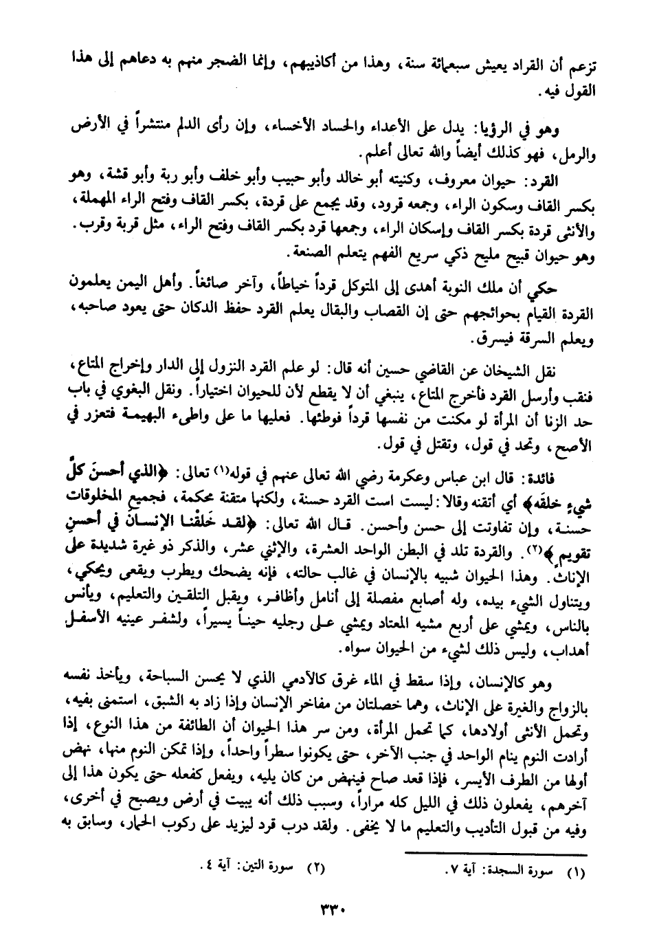 «2» . والقردة تلد في البطن الواحد العشرة، والإثني عشر، والذكر ذو غيرة شديدة على الإناث. وهذا الحيوان شبيه بالإنسان في غالب حالته، فإنه يضحك ويطرب ويقعى ويحكي، ويتناول الشيء بيده، وله أصابع مفصلة إلى أنامل وأظافر، ويقبل التلقين والتعليم، ويأنس بالناس، ويمشي على أربع مشيه المعتاد ويمشي على رجليه حينا يسيرا، ولشفر عينيه الأسفل أهداب، وليس ذلك لشيء من الحيوان سواه.