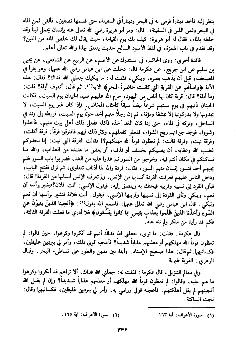 : روى الحاكم، في المستدرك عن الأصم، عن الربيع عن الشافعي، عن يحيى بن سليم عن ابن جريج، عن عكرمة قال: دخلت على ابن عباس رضي الله عنهما، وهو يقرأ في المصحف، قبل أن يذهب بصره، ويبكي، فقلت له: ما يبكيك جعلني الله فداك؟ فقال: هذه الآية وَسْئَلْهُمْ عَنِ الْقَرْيَةِ الَّتِي كانَتْ حاضِرَةَ الْبَحْرِ
